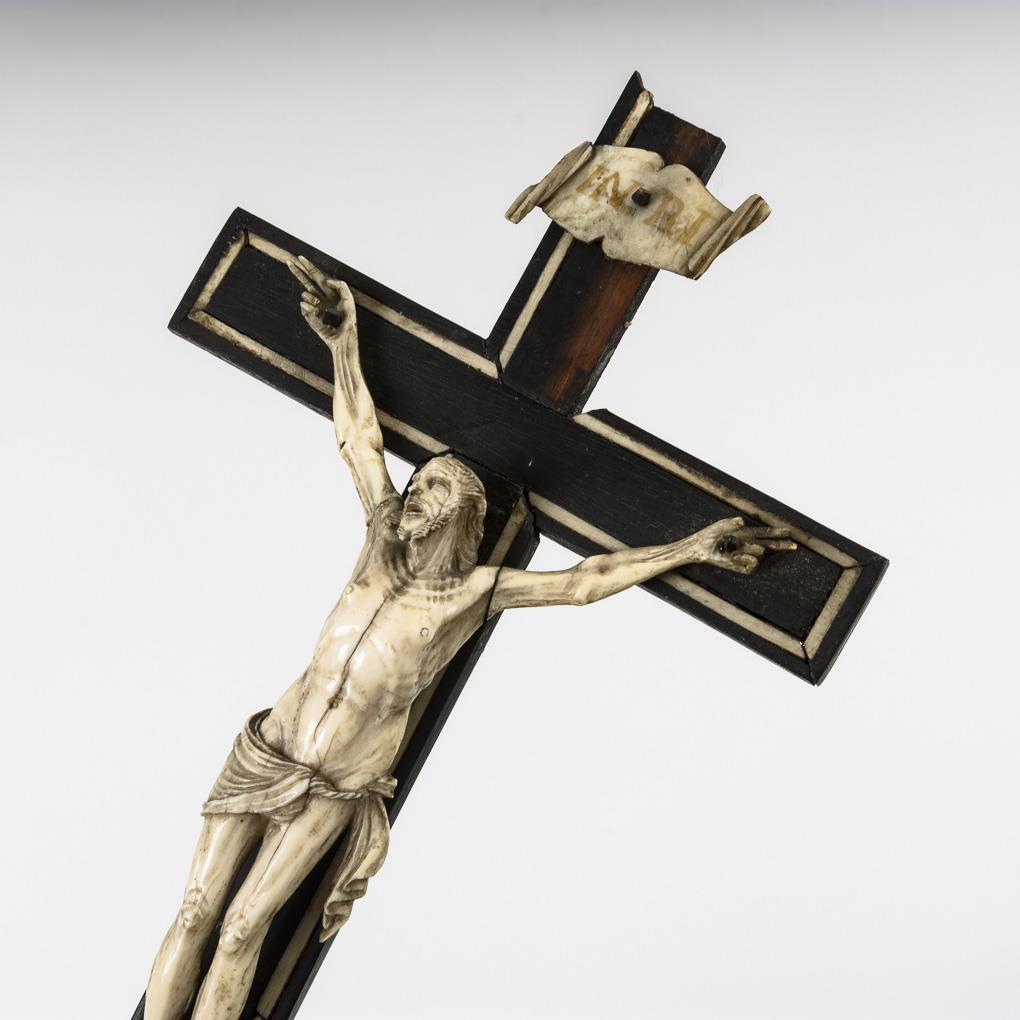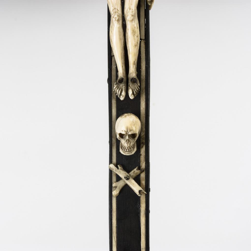 Elfenbein geschnitzt bzw. inkrustiert, Ebenholz(?). 18. Jh. Gesamt 41 x 10 x 7 cm.