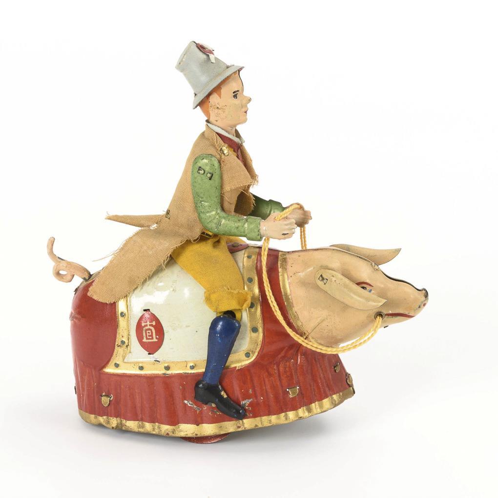 Auf einem Schwein reitender Mann mit Hut und Stoffkleidung. Werk intakt. Mit Altersspuren und kleinen Farbretuschen.