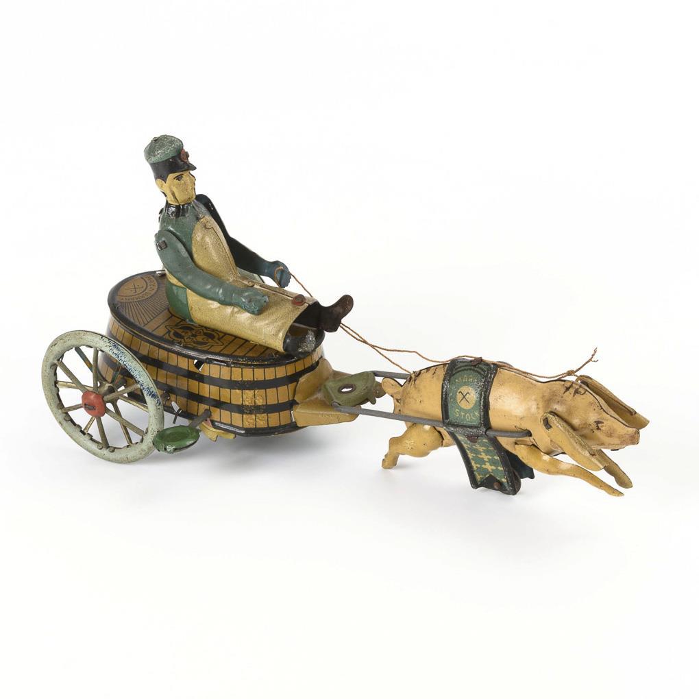 Kleines Gespann mit einem Schwein als Zugtier, einem Bottich als Wagen und einem Metzger als Kutscher. Uhrwerk intakt. Altersspuren.