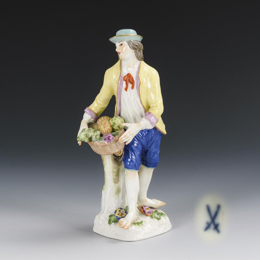 Entwurf von Johann Joachim Kaendler (1706 Dresden – 1775 Meißen) und Johann Friedrich Eberlein (1695 Dresden - 1749 Meißen). An einem Baumstamm mit Früchtekorb stehender junger Bauer.