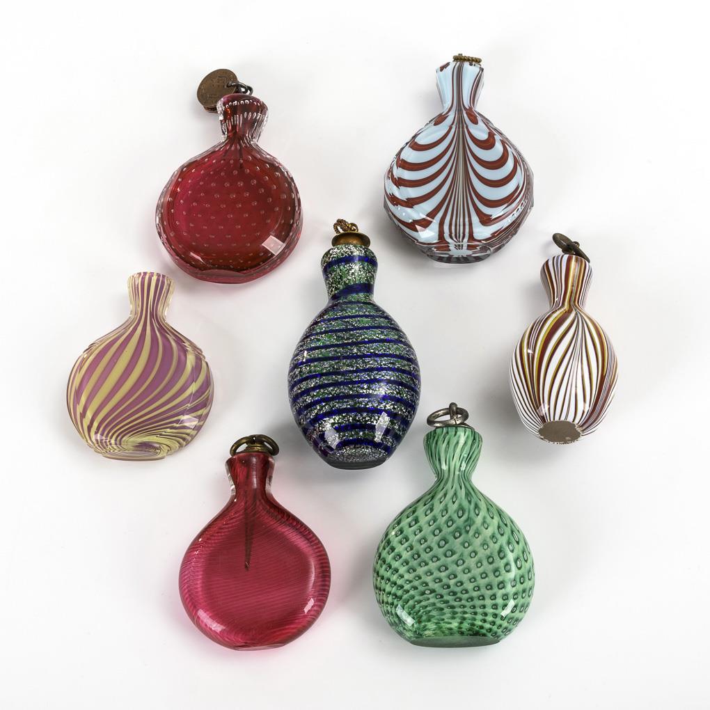 2x mit zweifarbigem, streifigem Innenfang, 1x mit rotem Innenfang und eingestochenen Luftblasen, 1x mit grün-weißem Netzmuster und eingestochenen Luftblasen, 1x mit rosalinfarbenem Innenfang, 1x mit grünem Innenfang, Silberflitter und eingeschmolzener Spirale aus blauem Glas, 1x mit weiß-gelb-braun gestreiftem, gekämmtem Überfang. 6x mit Metallverschluss.