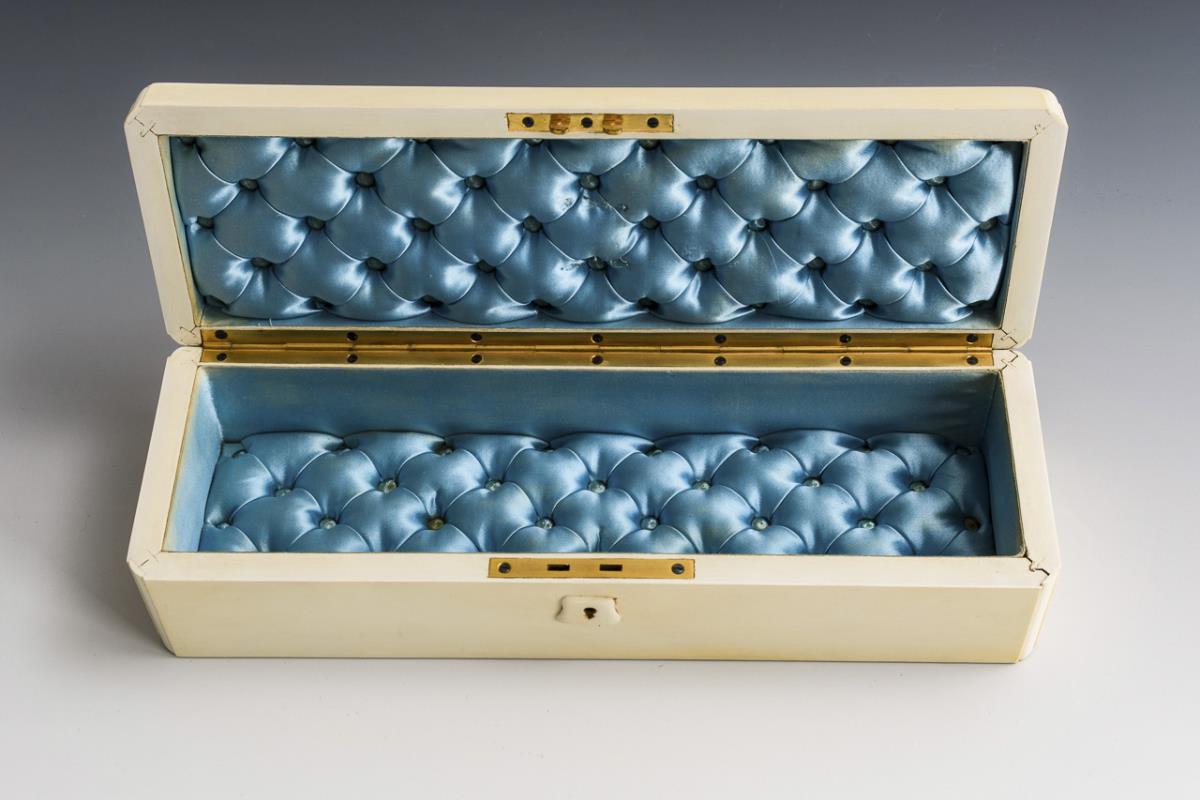 Holz , bis auf den Boden vollständig mit Elfenbein inkrustiert; innen blauer Samt. 8 x 30 x 10 cm.