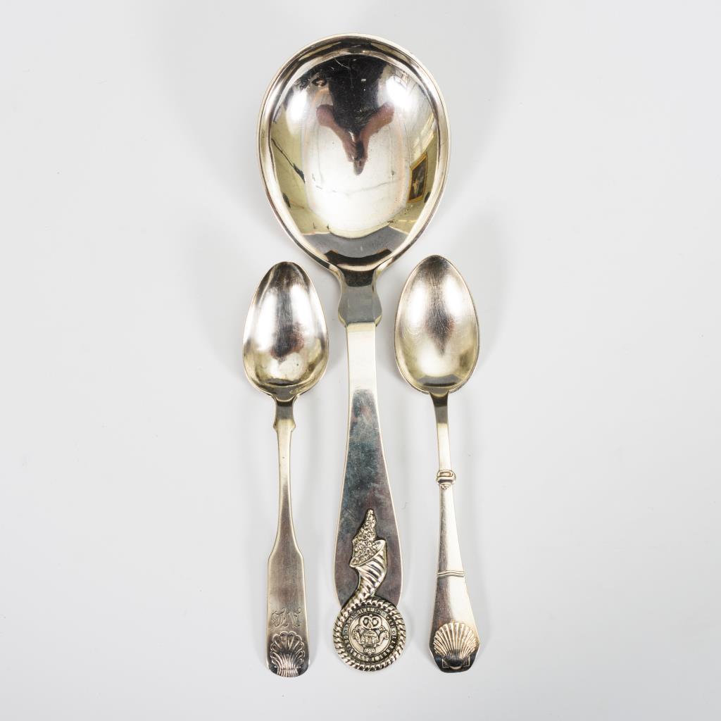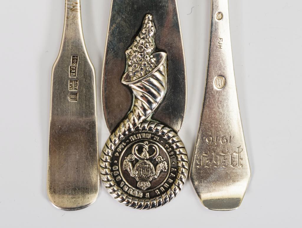 Vorlegelöffel mit Bäcker-Zunftzeichen ("Aarhus Bagerlaug 1934") am Füllhorn. Speiselöffel je mit Jacobsmuscheln, jeweils Monogramm-Gravur, 1x mit Datum 1916. 1x starke Gebrauchsspuren.