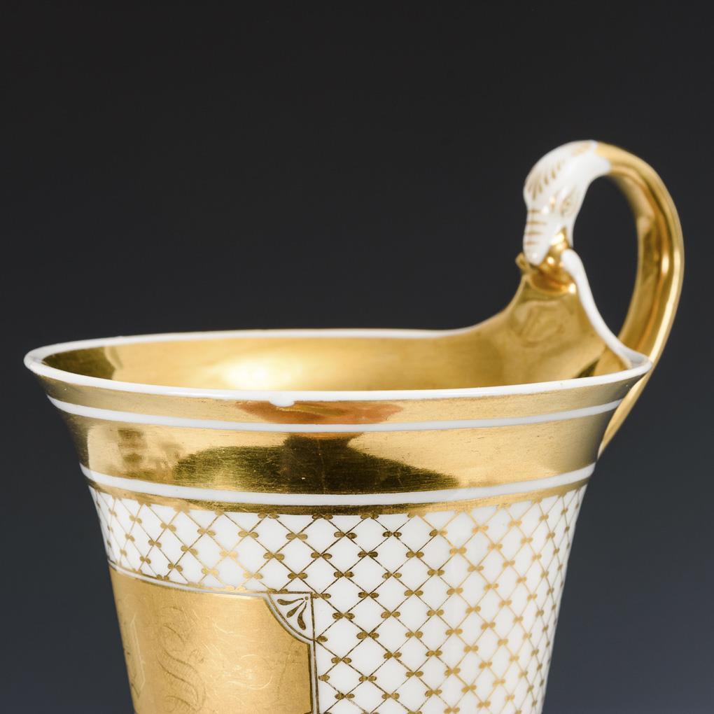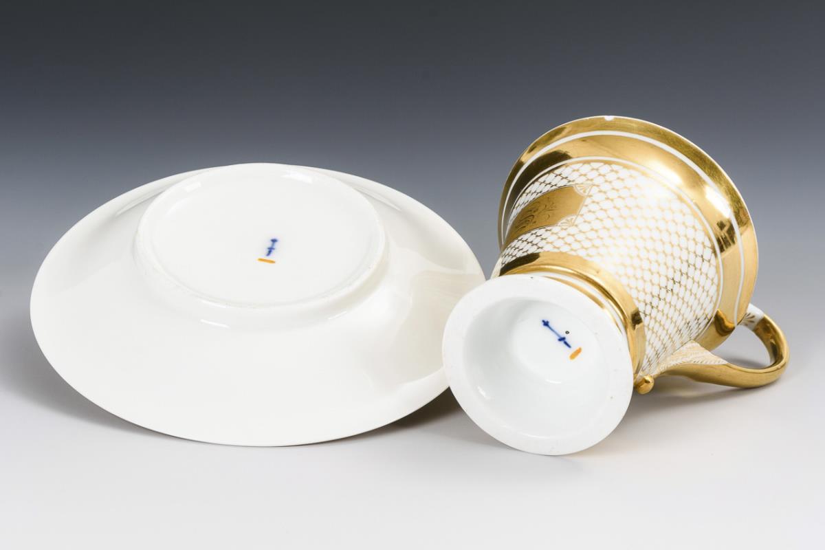 Kratertasse mit Schwanenhalshenkel. Schauseitig eine Goldkartusche mit dem gravierten Monogramm "F.S.", umlaufend goldenen Netzmuster. Kleiner Chip am Mündungsrand, minimale Goldbereibung im Untertassenspiegel.