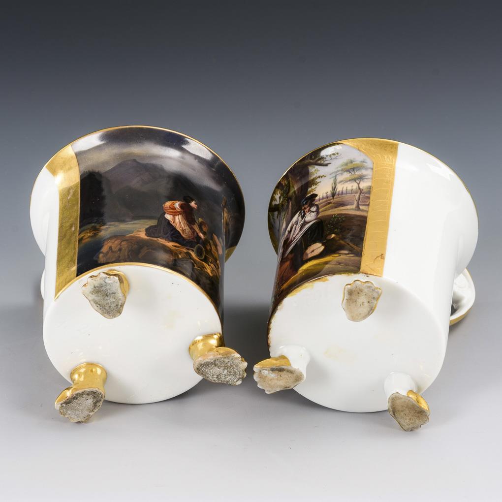 Zylindertassen mit Kraterrand, Rosettenhenkel und drei Tatzenfüßen. Schauseitig jeweils eine goldgerahmte Rechteckkartusche 1x mit der Darstellung einer jungen Frau, einem jungen Herren eine Blumenstrauß reichend und 1x mit der Darstellung einer Mutter mit Tochter, vor einem Kreuz im Gebirge betend. 1x kleine Fußbestoßung und minimaler Goldabrieb.