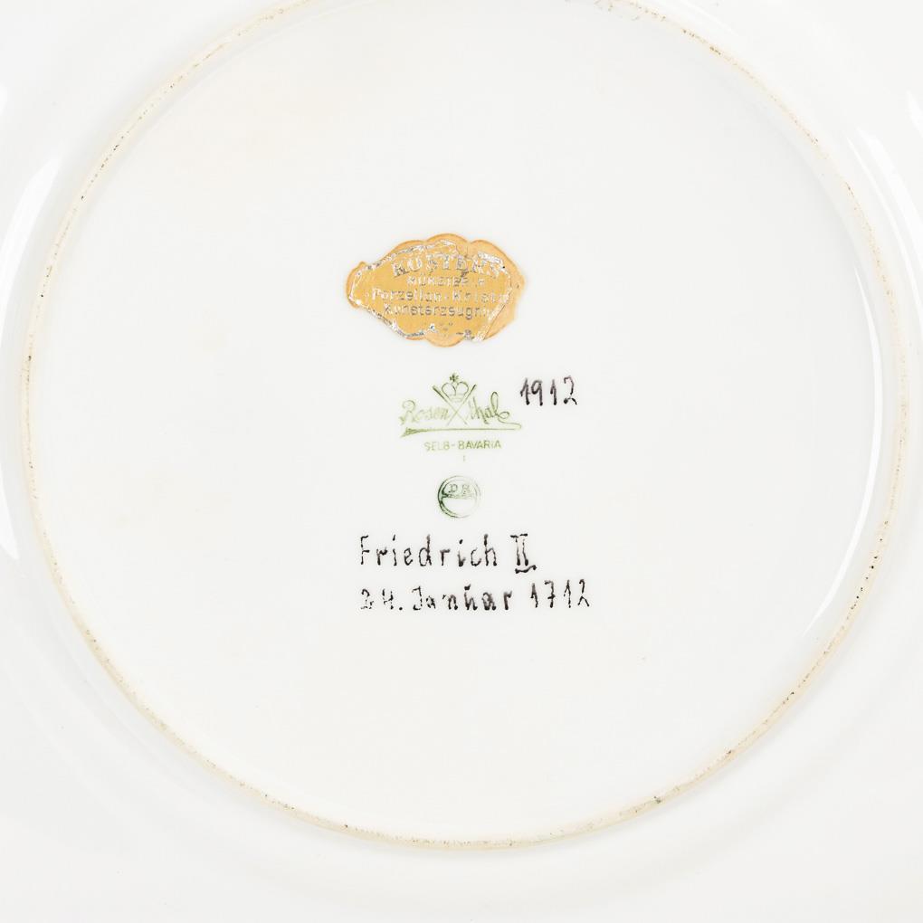 Teller im Wiener Stil mit reliefgoldgemalten Girlanden auf grünem Fahnenfond, im Spiegel das Porträt des preußischen Königs Friedrich II. nach einem 1781 entstandenen Gemälde von Anton Graff.