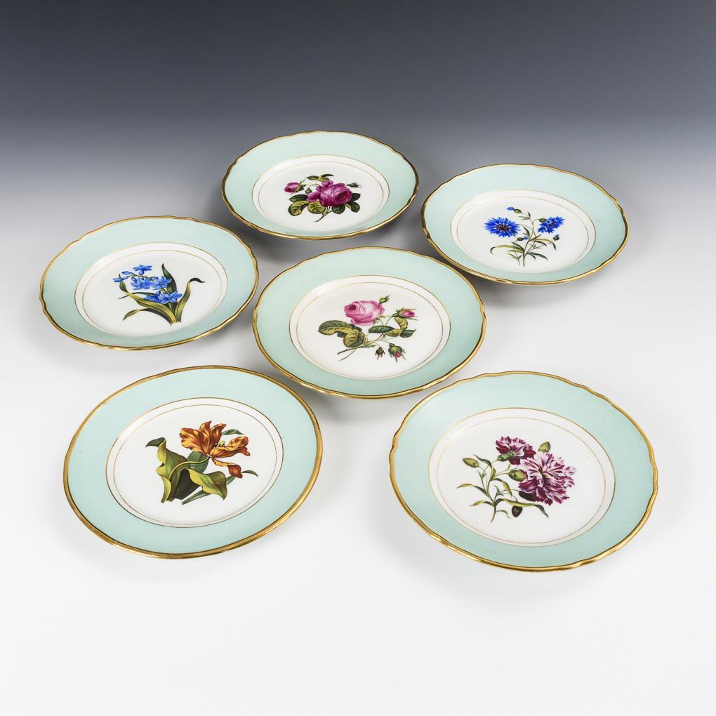 Teller mit mintgrünem Fond und der Darstellung einer Pflanze im Spiegel. Partiell minimaler Goldabrieb.
