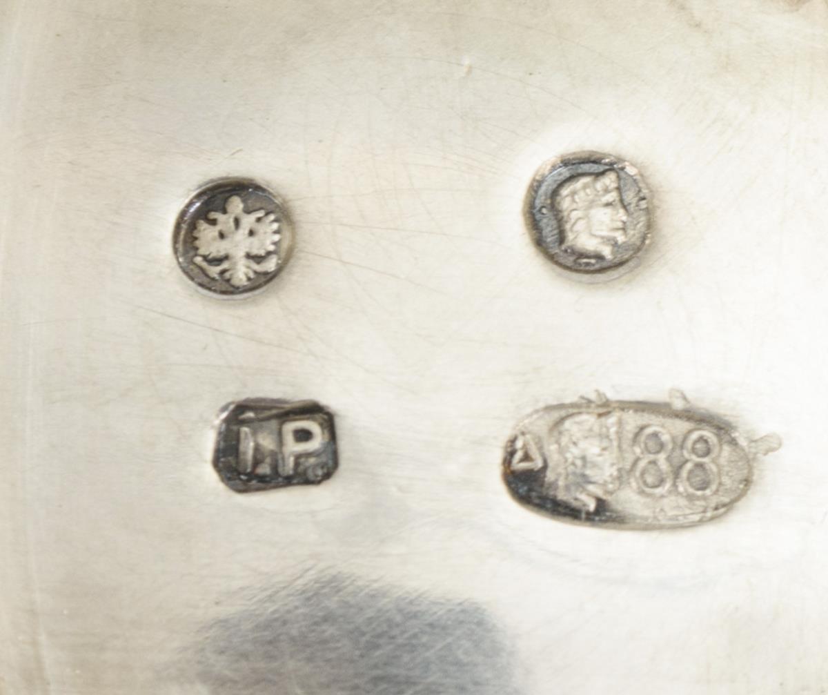 Beschauzeichen Doppelkopfadler/runder Männerkopf/Meisterzeichen IP/Kokoschnikmarke 88 Zolotniki gepunzt. 1908-1926. Warschau (?).