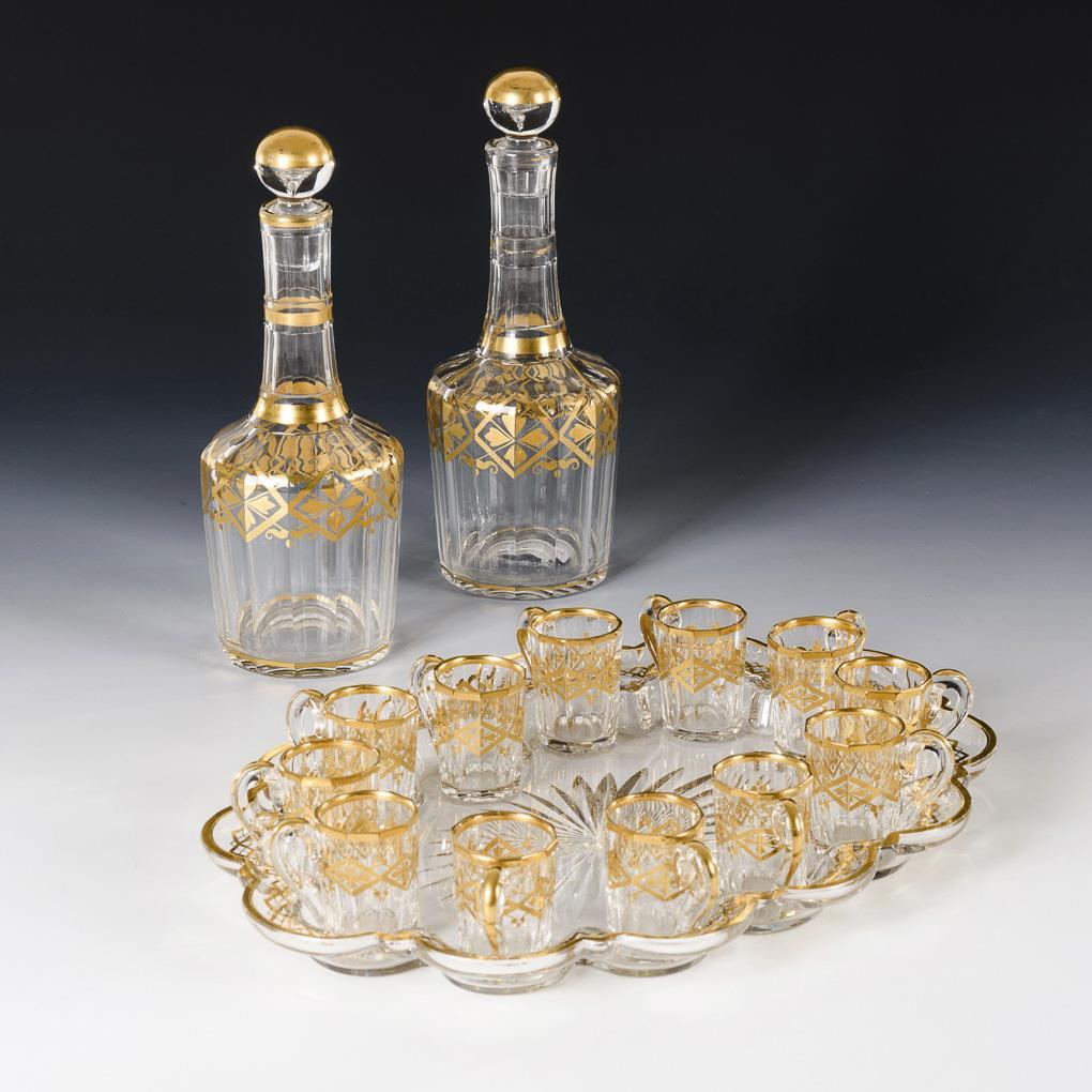 2 facettierte Karaffen (H 22 cm), 12 Henkelbecher als Schnapsgläser (H 4,5 cm) und 1 mehrpassiges Tablett (L 32,5 cm). 1 minimale Bestoßung am Tablettrand, Mündungsränder der Karaffen bestoßen.