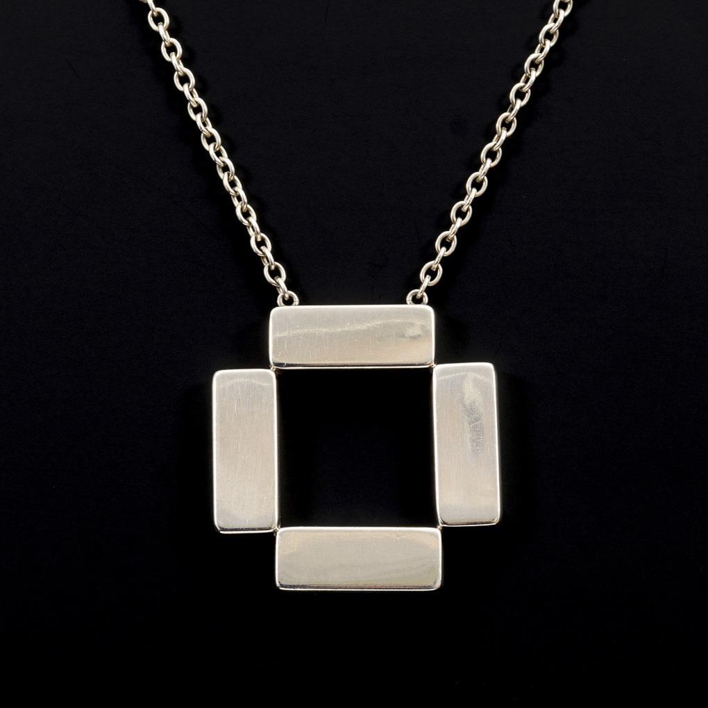 Silber 925 gestempelt. Entwurf: Astrid Fog, Kopenhagen um 1970. Modell Nr. 379. Anhänger 5,5 x 5,5 cm. Kette L 84 cm. 56,2 g.