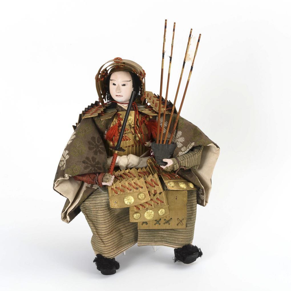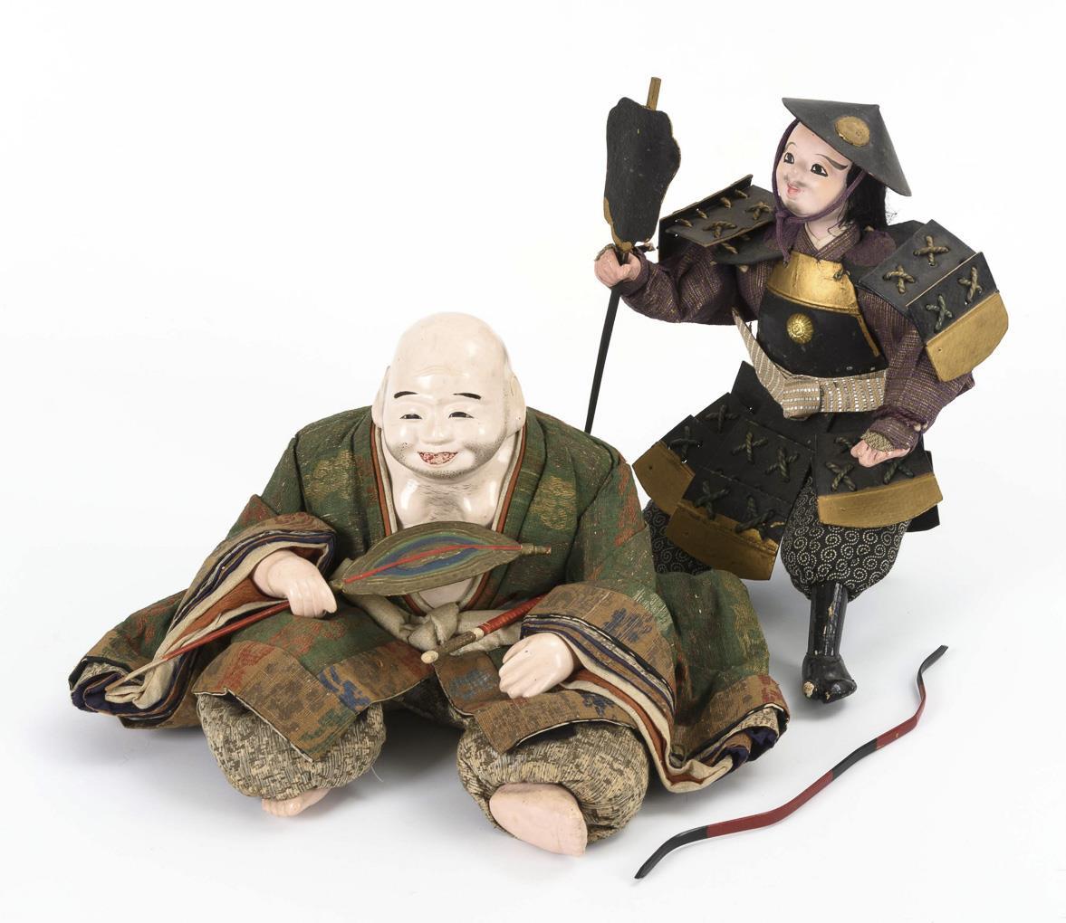 Verschiedene Figuren mit Muschelkalkgesichtern, eingelegten bzw. gemalten Augen und schwarzen Haaren. 2 Krieger (Samurai in voller Rüstung) und 1 sitzender Buddha (mit Schriftzeichen unter dem Gewand). Altersspuren, kleine Defekte.