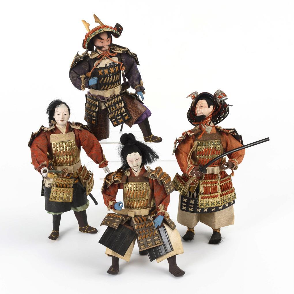 4 verschiedene Samurai-Krieger in voller Rüstung, mit eingesteckten Muschelkalk-Köpfen, eingelegten Glasaugen und schwarzen Haaren. Leichte Altersspuren, kleine Defekte.