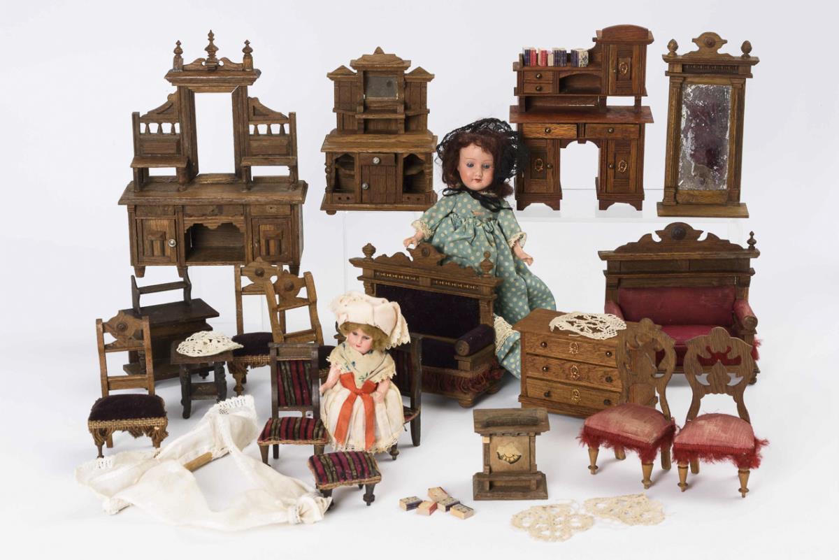 2 Buffets, 2 Sofas, 1 Kommode, 1 Schreibtisch, 7 verschiedene Stühle, Sideboard, Beistelltisch, 1 Standspiegel, Uhr, Hocker. / Dazu 2 Spritzkopfpüppchen (L 14 und 22 cm) in alter Kleidung, 14 "Bücher", 1 Gardine und 4 Spitzendeckchen. Alters- und Gebrauchsspuren, teils Defekte und Reparaturen.