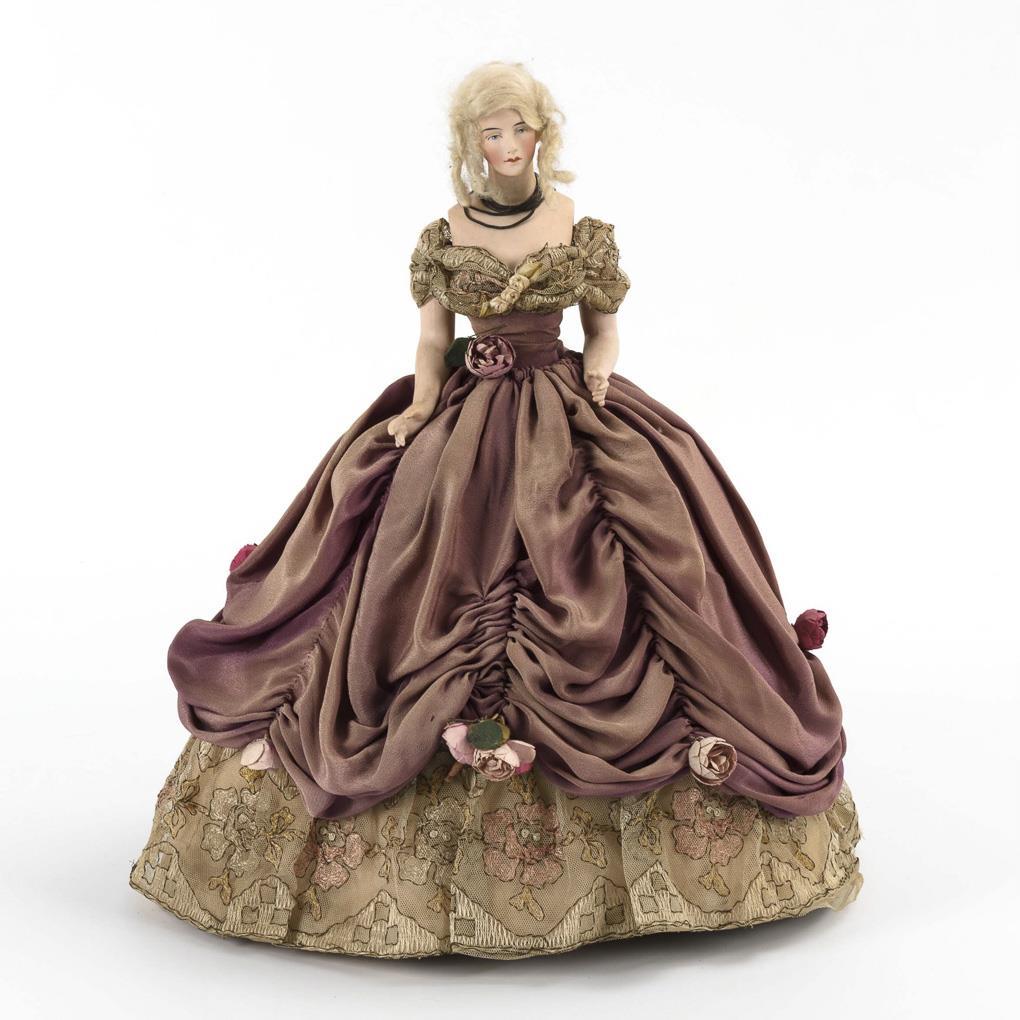 Büste mit gemalten blauen Augen, blonder Mohairperücke und etwas locker gespannten Armen. Verblichenes violettes Originalkleid auf Drahtgestell. Keine Defekte am Porzellan sichtbar. Kleid mit Altersspuren.