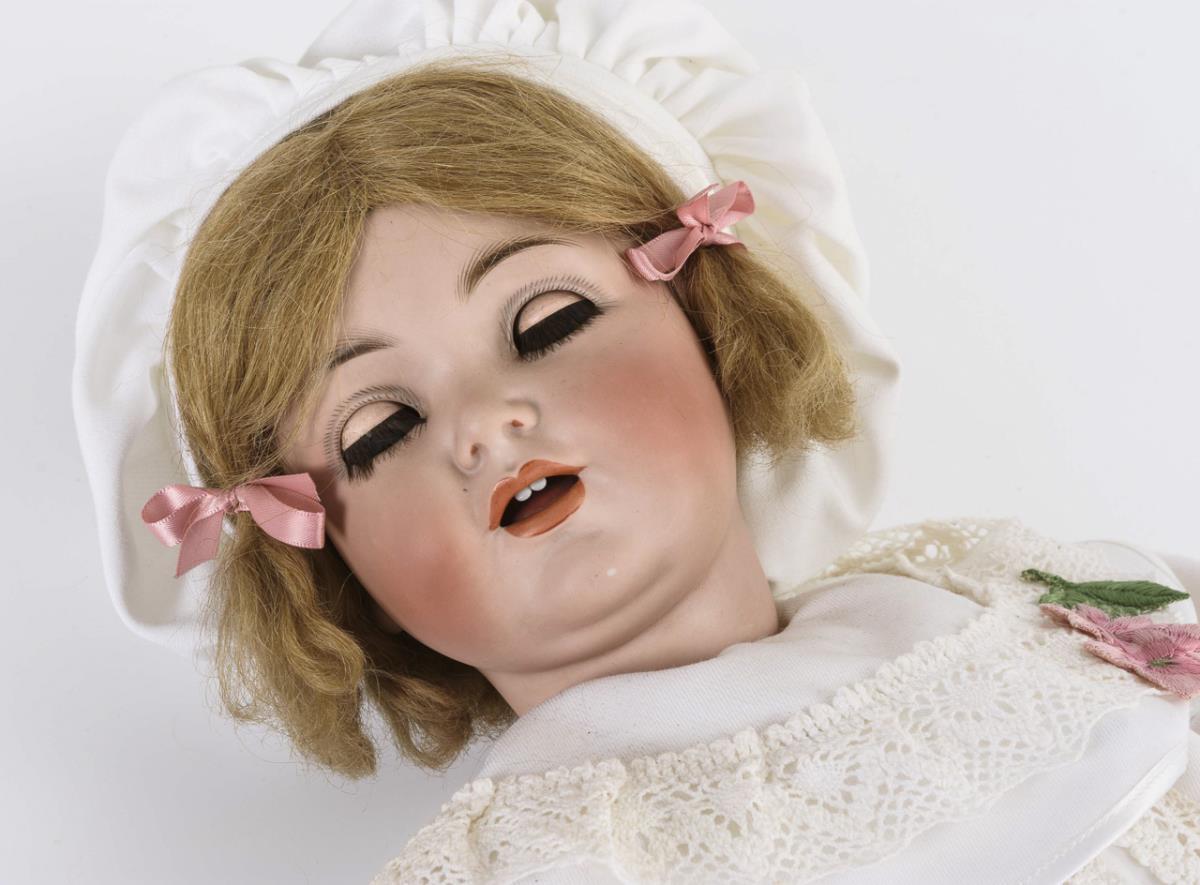 Kurbelkopf, blaue Schlafaugen, Wimpern, bewegliche Zunge, blonde Echthaarperücke. 15-teiliger Gliederkörper. Weißes Kleid, schwarze Lackschuhe. Kopf durchleuchtet: ohne Defekte. Hände übermalt (alt repariert).