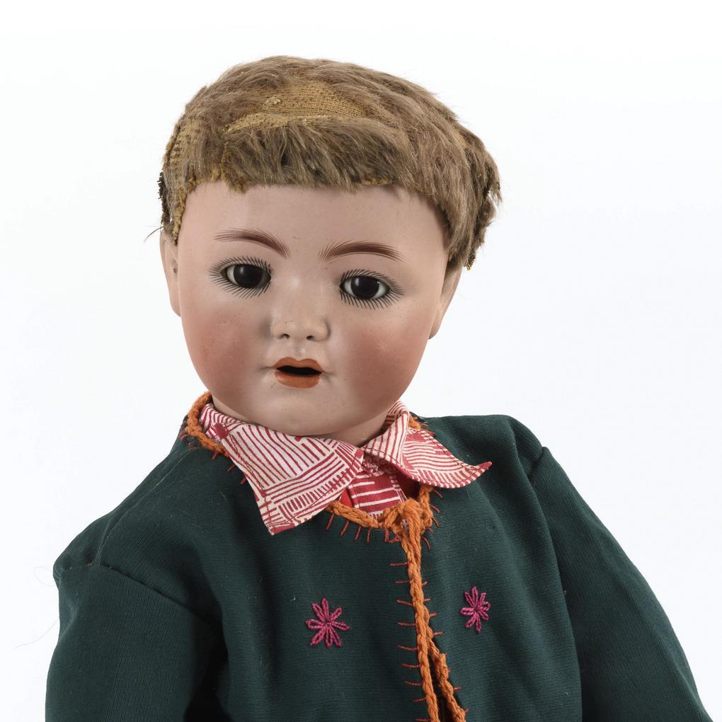 Kurbelkopf, braune Schlafaugen, offene Nasenlöcher, Mohairfell-Perücke mit Fehlstellen. 15-teiliger Toddlerkörper mit rotem Stempel "K & W, Made in Germany". Grüner Anzug mit Stickerei. Kopf durchleuchtet: ohne Defekte. 1 Finger repariert.