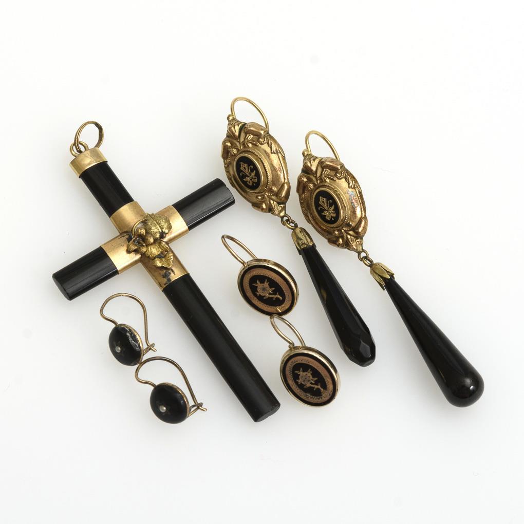 Onyx-Kreuzanhänger und 3 Ohrhängerpaare mit partiellem Schwarzemail. Einhängehaken. 2 verschiedene Abhängungen ergänzt.