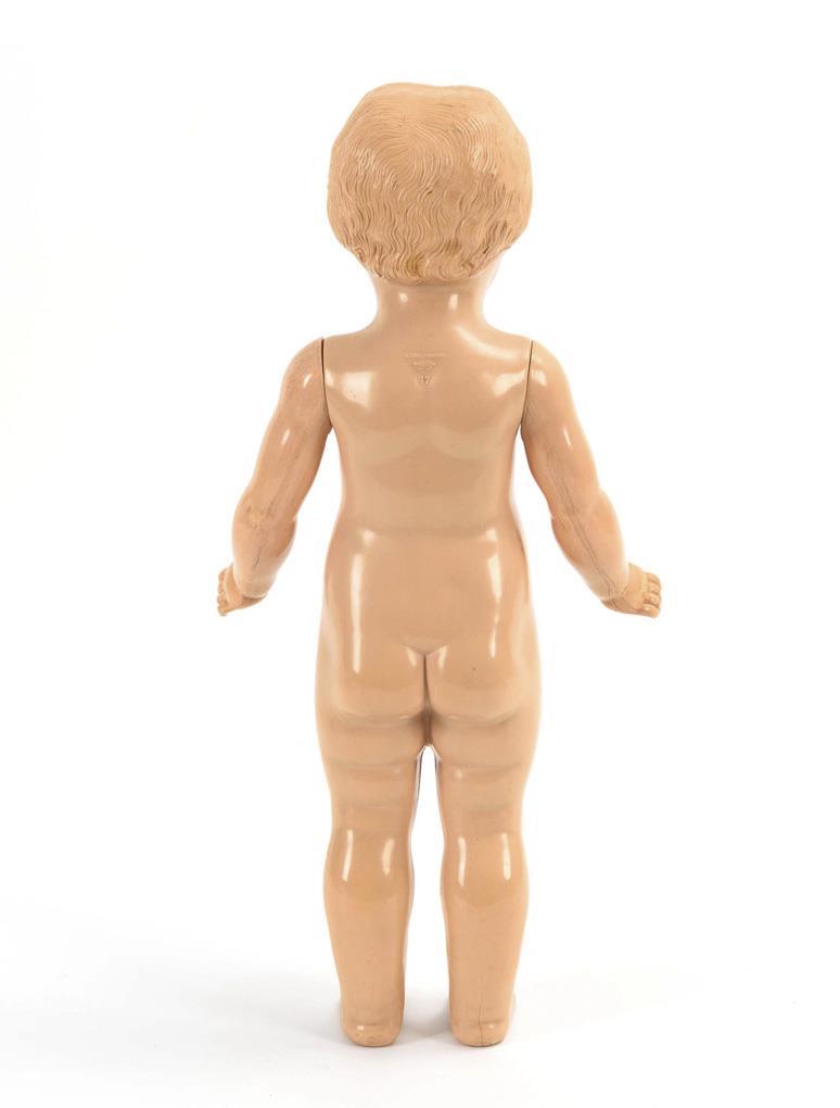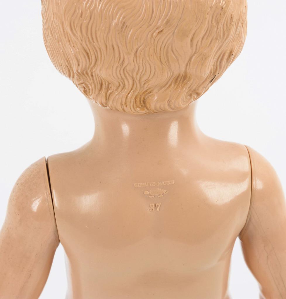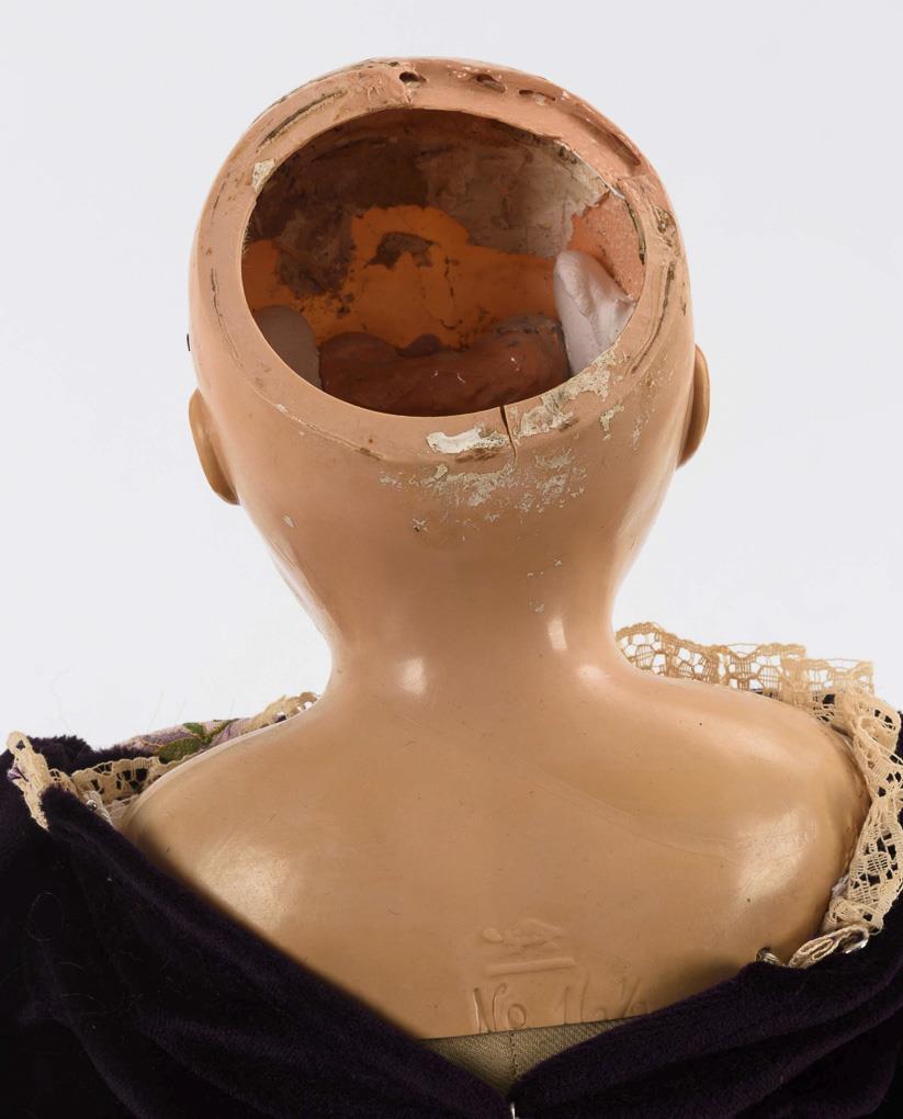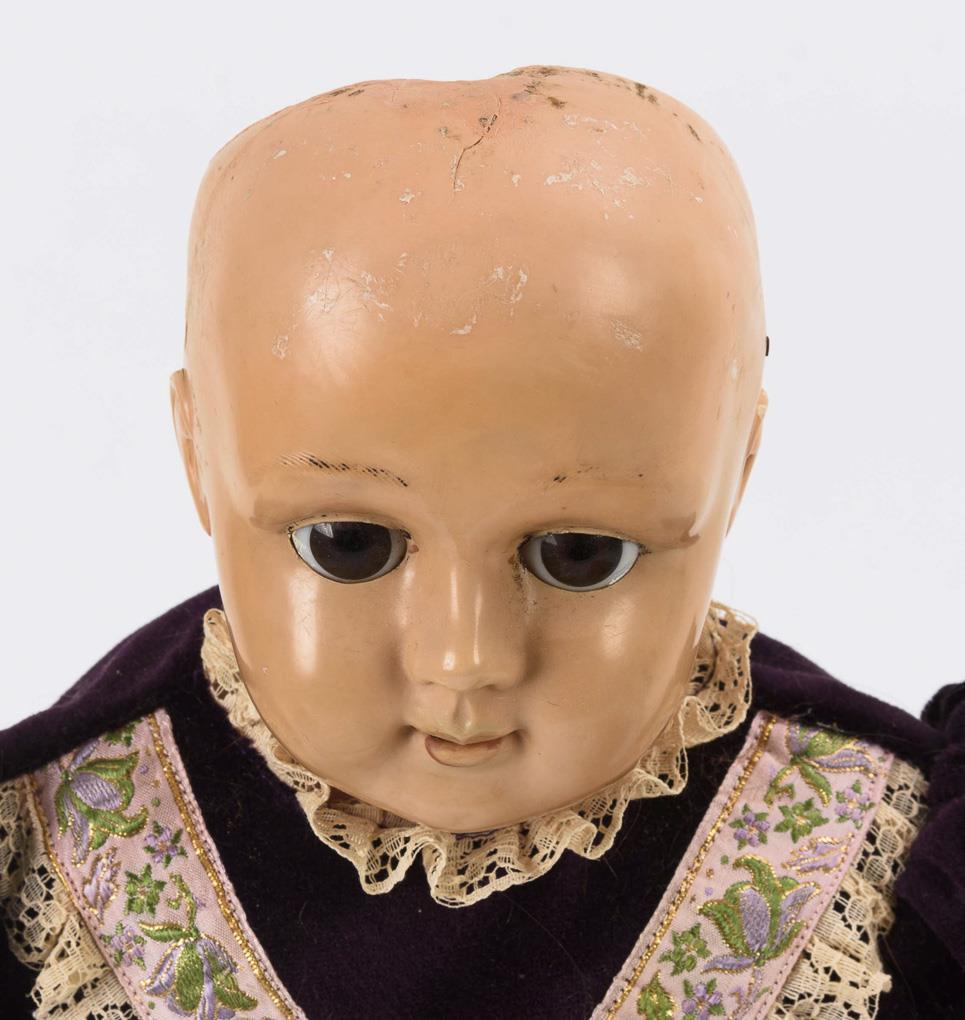 Frühe Stehpuppe mit festem Kopf, gemalten Augen und modellierten Haaren. Weißes Kleid. Brustkopfpuppe mit festen braunen Glasaugen, geschlossenem Mund und blonder Mohairperücke. Stoffkörper mit Celluloidarmen. Jünger ergänztes, dunkelviolettes Samtkleid. Stehpuppe ohne Defekte. Brustkopfpuppe mit Reparatur und kleinen Defekten am Kopf, Arme geklebt.