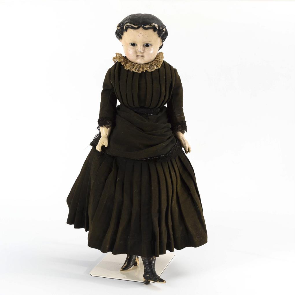 Sonneberger Puppe mit eingelegten braunen Augen und schwarzen modellierten Haaren. Schlanker Stoffkörper mit Massearmen und schön modellierten Beinen mit Absatzstiefeln. Originales schwarzes Kleid. Altersspuren, Haare und Stiefel stärker berieben.