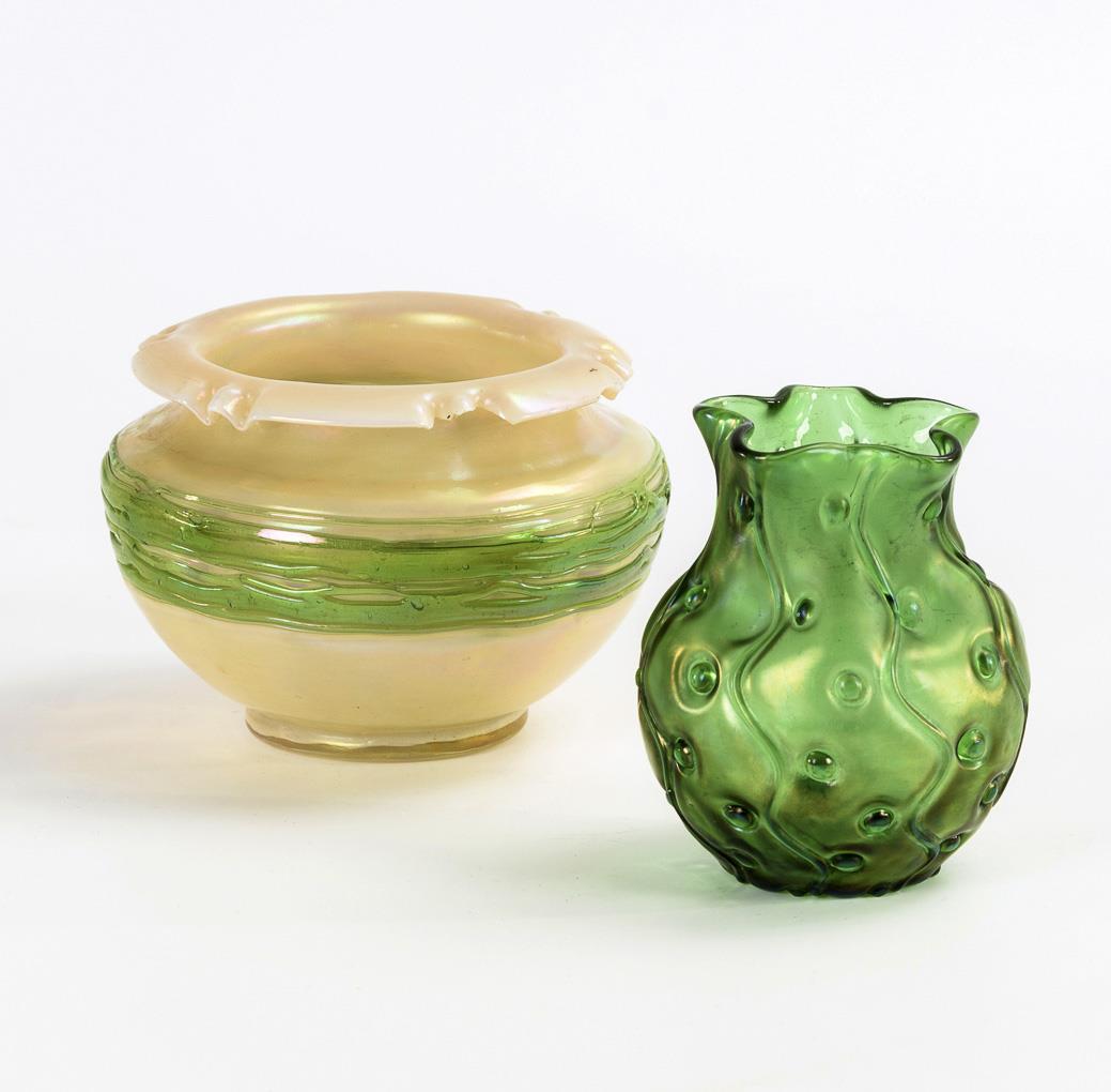 1x bauchige, längsoptisch formgeblasene Vase aus farblosem Glas mit Opalglasinnenfang und aufgeschmolzenem Fadennetzband aus grünem Glas, irisiert (H 10,5 cm). / 1x kleine bauchige Vase aus grünem Glas mit fünffach ausgezogenem Mündungsrand, kleinen, eingeschmolzenen Glaskugeln und wellenartig aufgeschmolzenen Fäden (H 11,5 cm). 2 Bestoßungen am Rand der Opalvase.