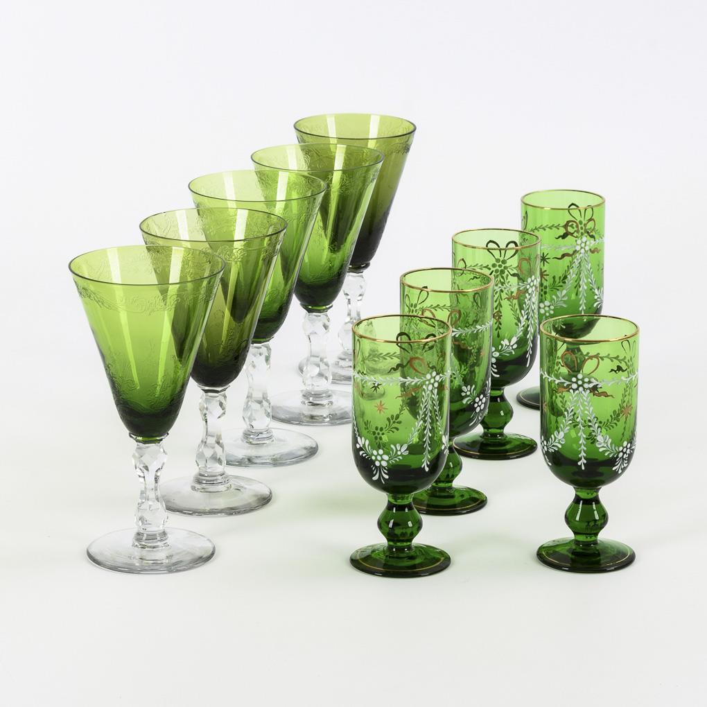 Farbloses und grünes Glas, Ätzdekor bzw. weiße Emailmalerei, teils Goldstaffage. H 11,5 und 14,5 cm.