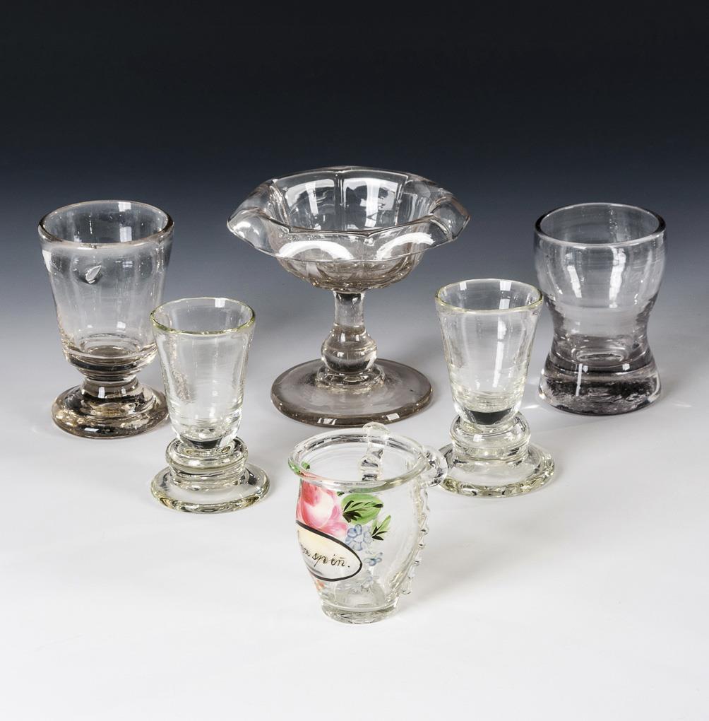4 verschiedene Kelchgläser aus dickwandigem Glas (H 9,5 - 10,5 cm), Zuckerschale (H 11 cm) und seltenes Spinnrand-Netznäpfchen mit schauseitiger Blumenmalerei und der Aufschrift "Ana spinn.".