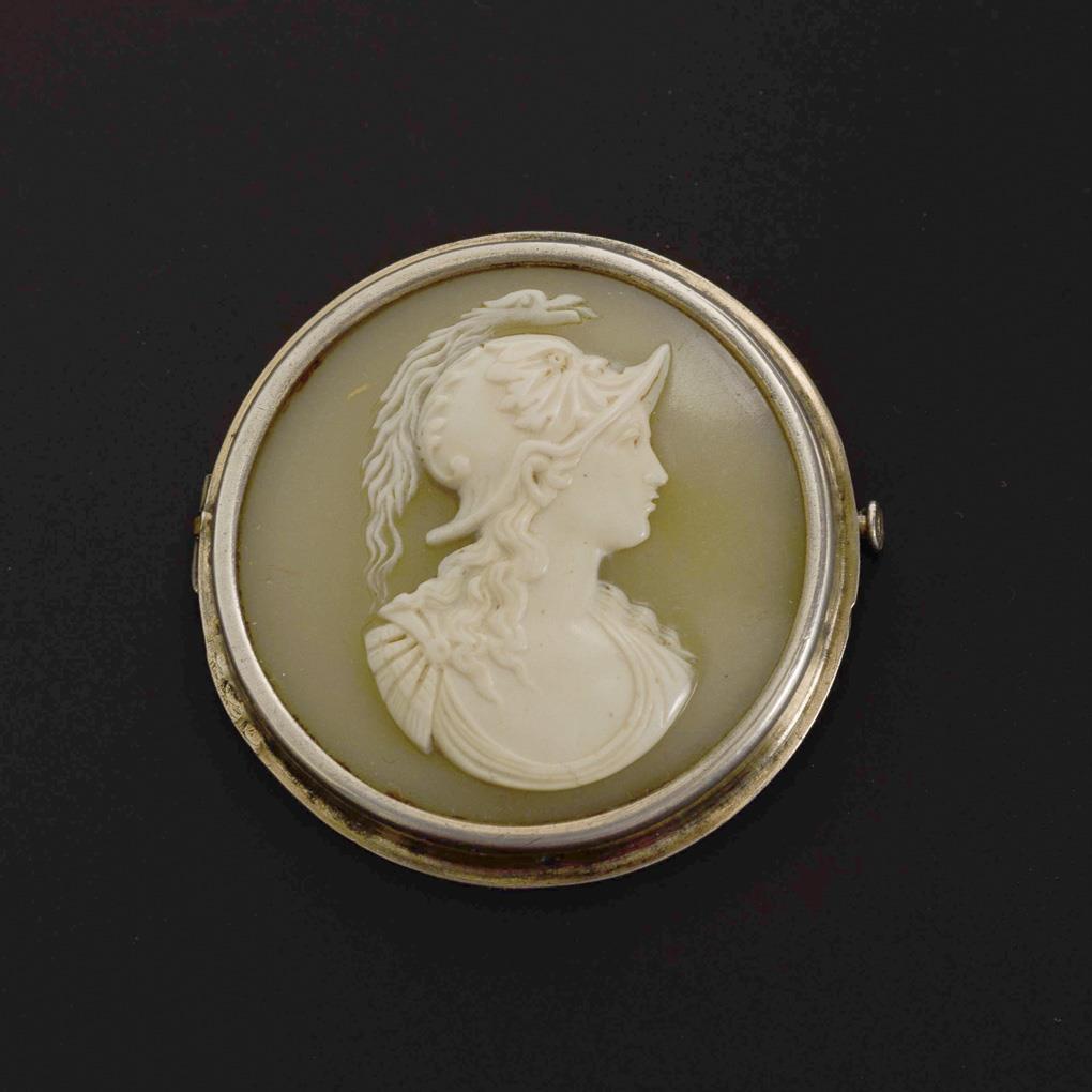 Zargengefasste Achat?kamee mit antikisierend geschnittenem Minerva-Profilkopf. Schiebehaken.