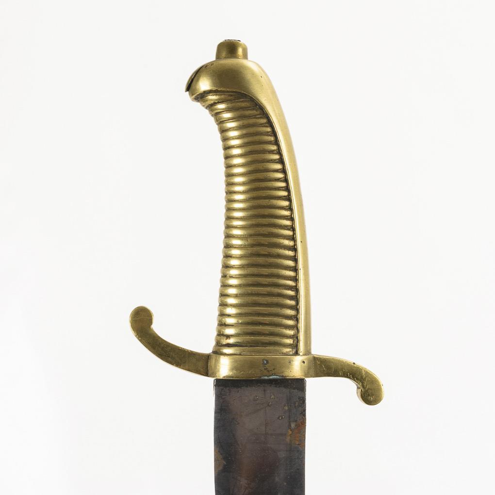 Wohl Griff eines Jägerhirschfängers, Preußen M 1857. Messinggriff mit waagerecht-geripptem Griff, vorstehende Knaufschraube mit aufgeschraubter Platte. Geschwungene Parierstange. Gerade, einschneidige Klinge. Lederschlaufe. Klingenspitze abgeschliffen. Stoßleder fehlt, dadurch wackelt die Klinge ein wenig.
