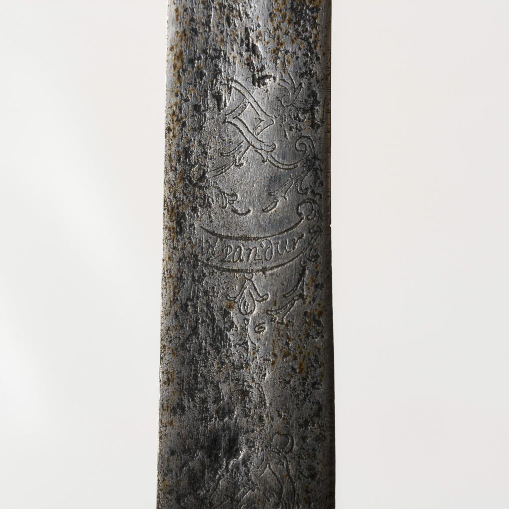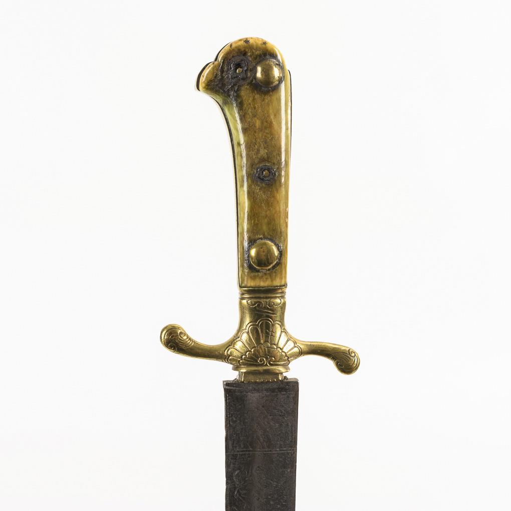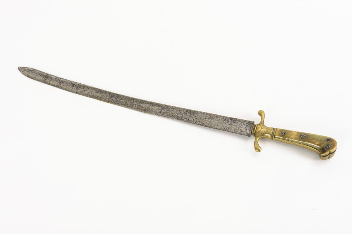 Griff aus zwei ursprünglich grün gefärbten Hornschalen auf Messinghalterung, Parierstange leicht geschwungen. Alte, einschneidige Klinge, leicht gekrümmt, mit Schör. Reste figürlicher Gravierung, lesbar "Pandur". Klinge mit Korrosionsnarben.