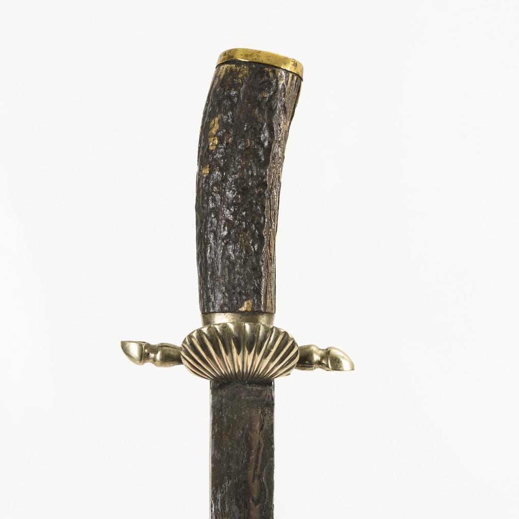 Geweihgriff aus zwei Halbschalen, Messingkappe am Ende. Parierstange mit Hufenden und Muschelstichblatt in silberfarbenem Metall. Gerade, einschneidige Klinge mit starken Korrosionsnarben.