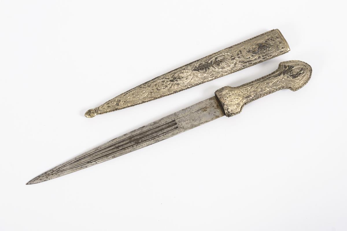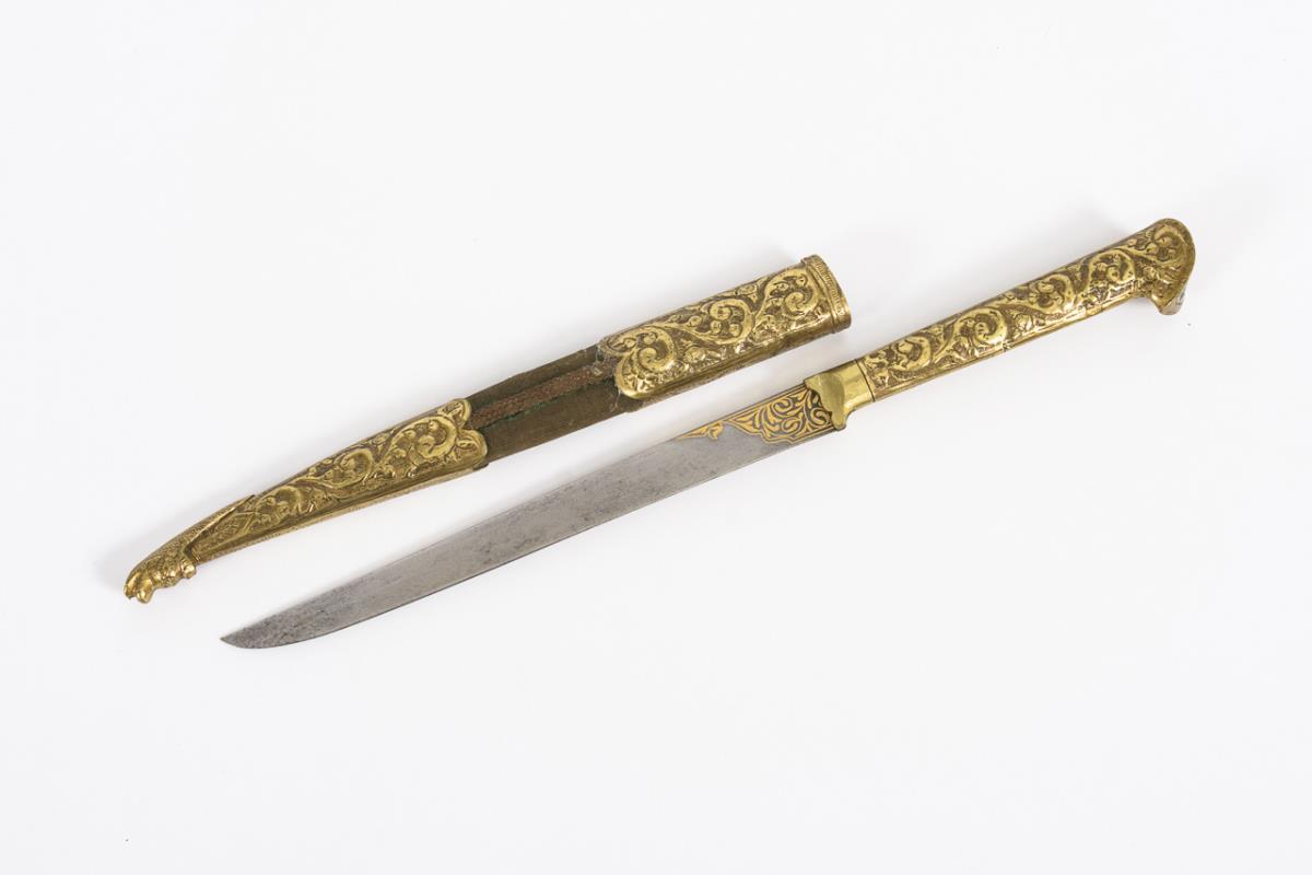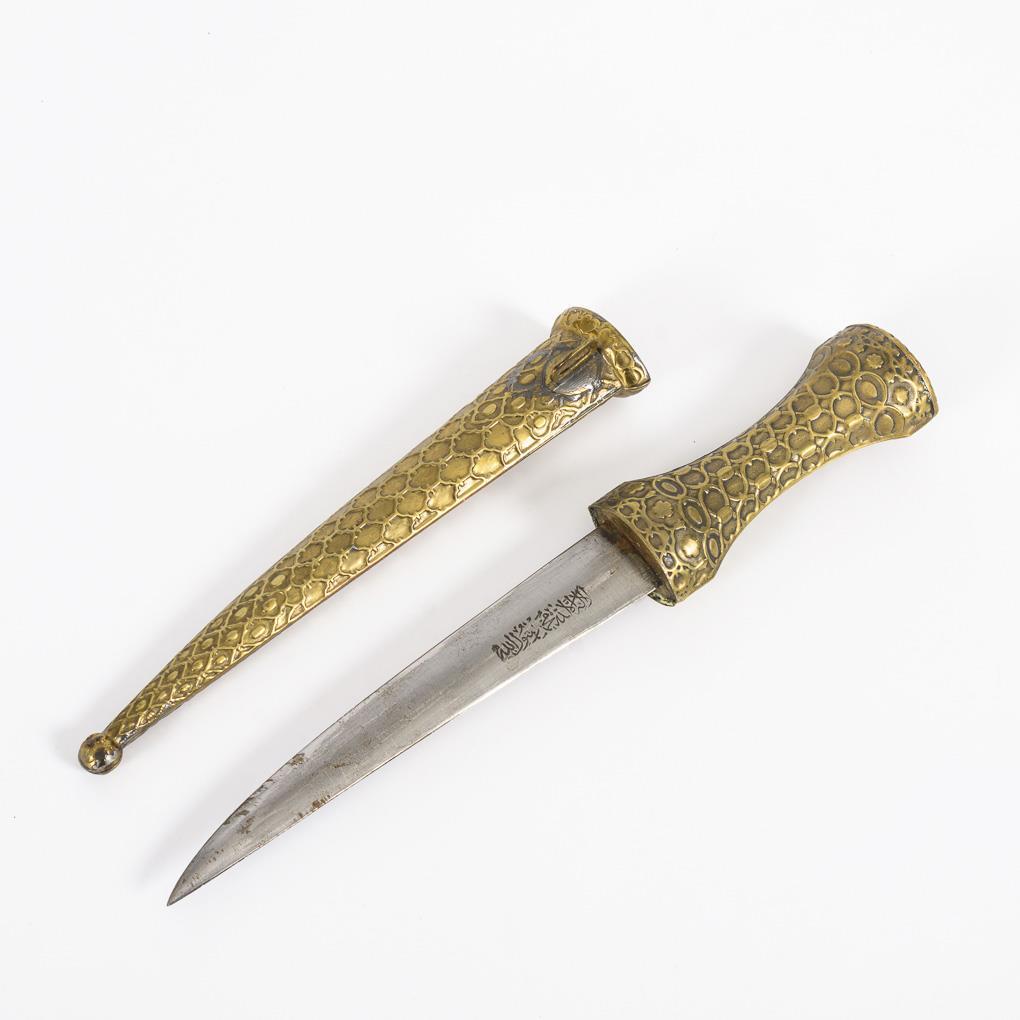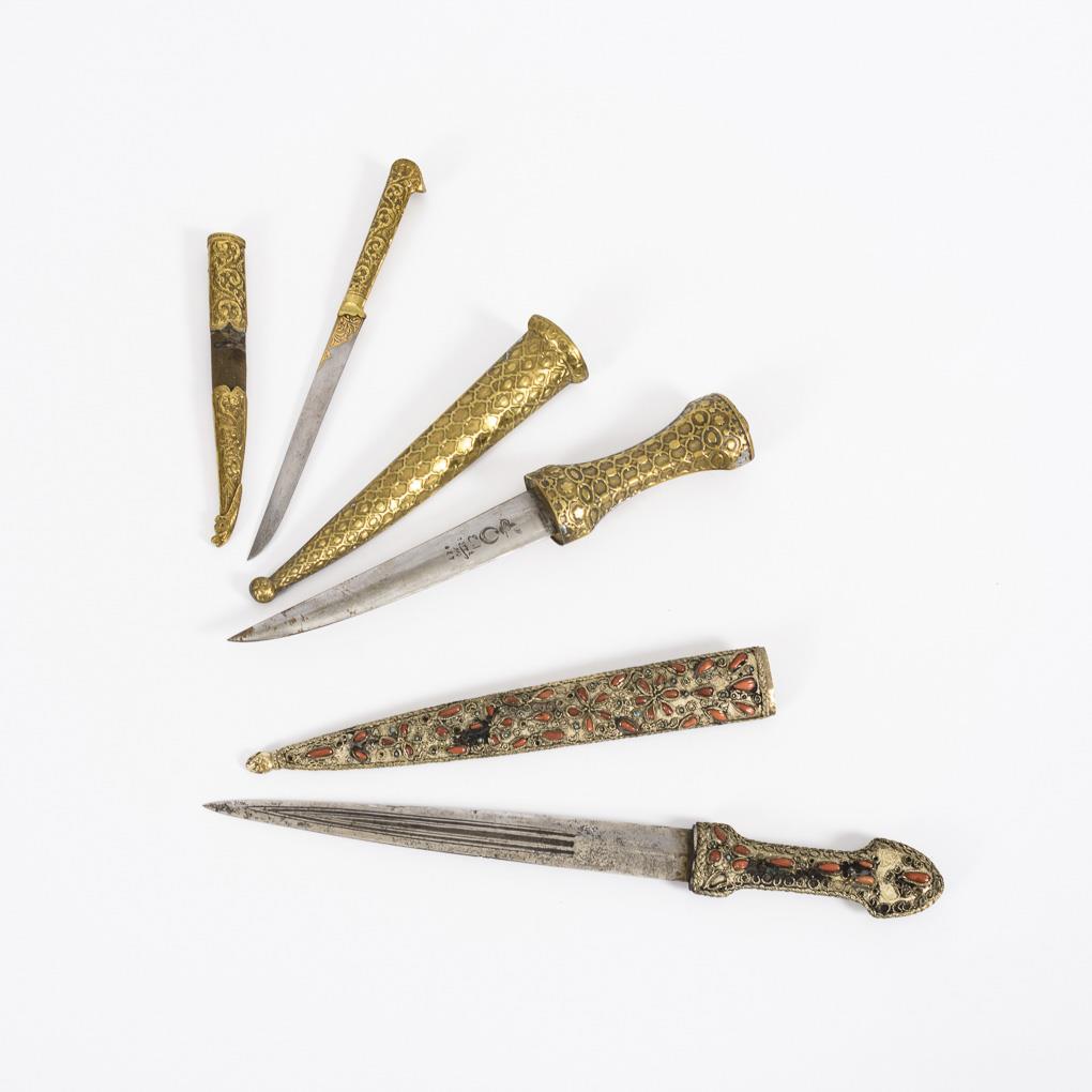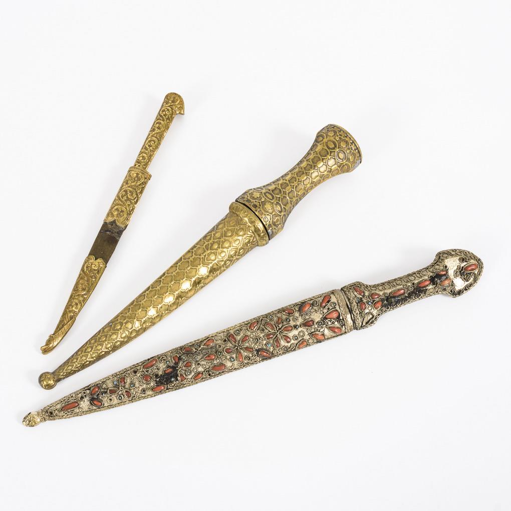 Waffe mit Korallenbesatz: Gerade, zweischneidige Klinge mit dreifachem Hohlschliff. Griff und Klinge mit tropfenförmigem Korallbesatz und kleinen Türkisen in Stegfassungen. Viele Türkise fehlen, Koralle nur eine Fehlstelle. Rückseite mit feinem Metall-Reliefmuster. Gesamt L 41 cm / Kleines Messer mit intarsierter Klinge. Gerade einschneidige Klinge mit Goldmusterung, wohl auch Schriftzug. Griff und Holzscheide mit getriebenem Messing belegt. Qualitätvolle Arbeit mit Altersspuren. L 29,5 cm. / Waffe in Messingoptik, aus dem arabisch-persischen Raum. Zweischneidige, leicht gekrümmte Klinge mit arabischen Schriftzeichen, Halbmond und Stern. Griff und Scheide mit getriebenem Messing ummantelt. L 36 cm.
