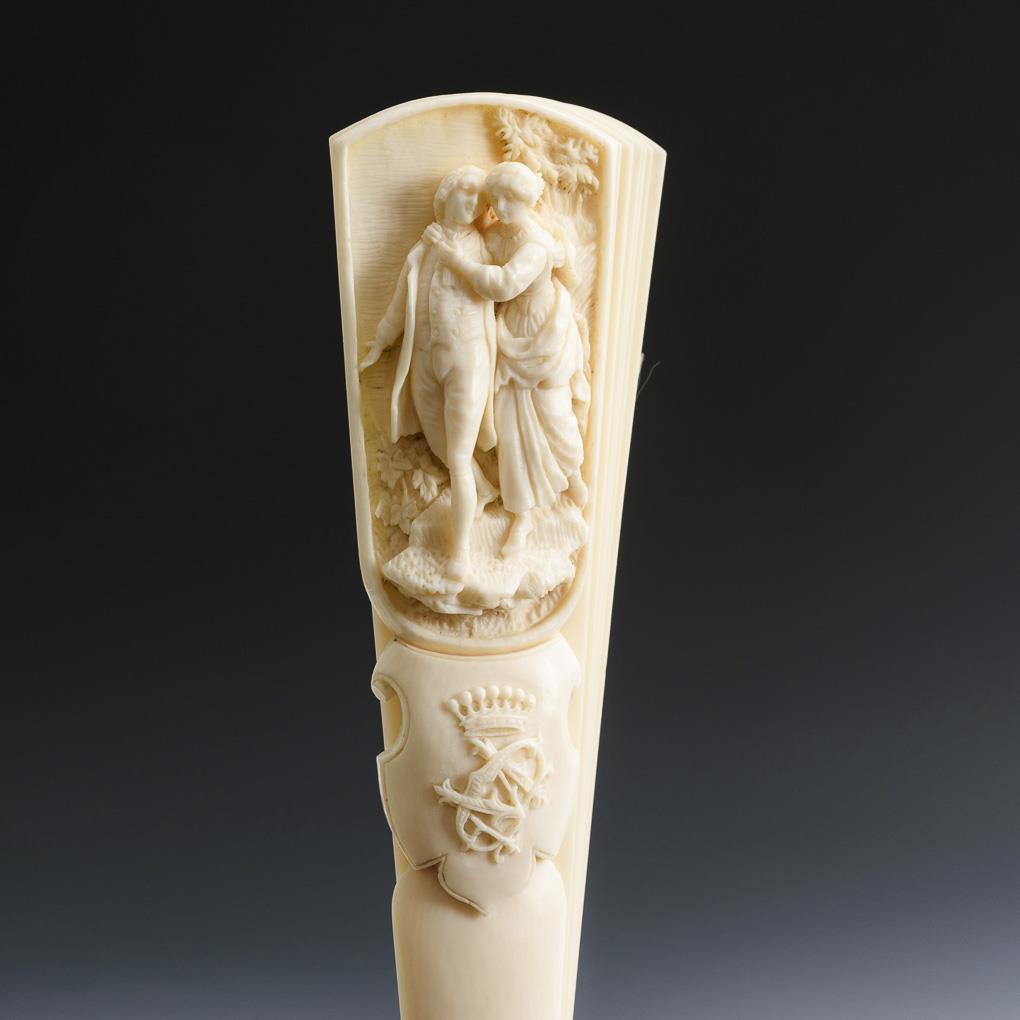 Elfenbeinfächer mit Liebespaar und Adelsmonogramm.