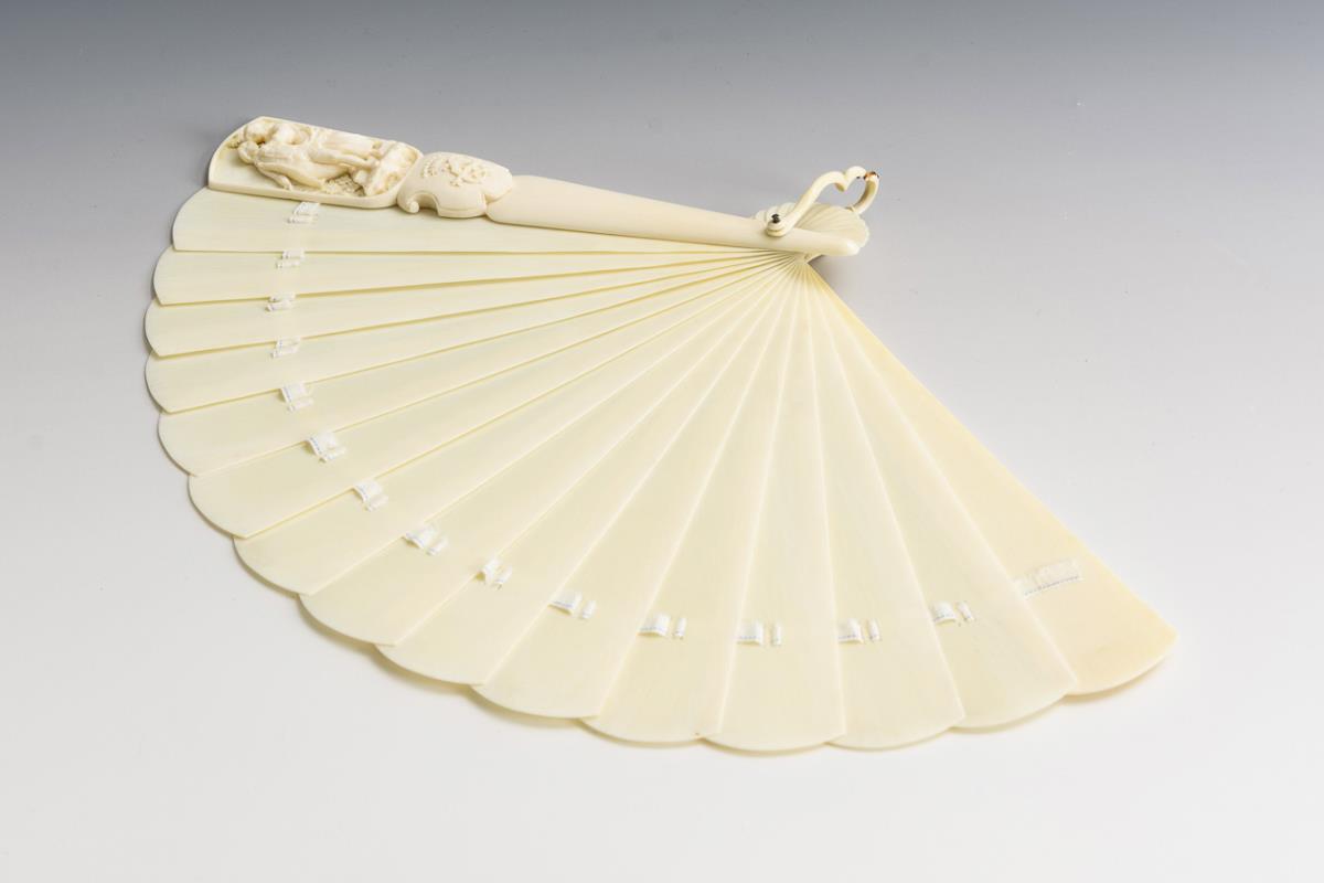 Briséfächer mit Hochrelief auf dem massiven, aus einem Stück geschnitzten Deckblatt: Rokoko-Paar bzw. Monogramm CM unter Krone. Bügel gebrochen.