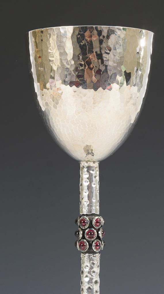 Handgearbeiteter Silberpokal mit Edelsteinbesatz am Schaft.