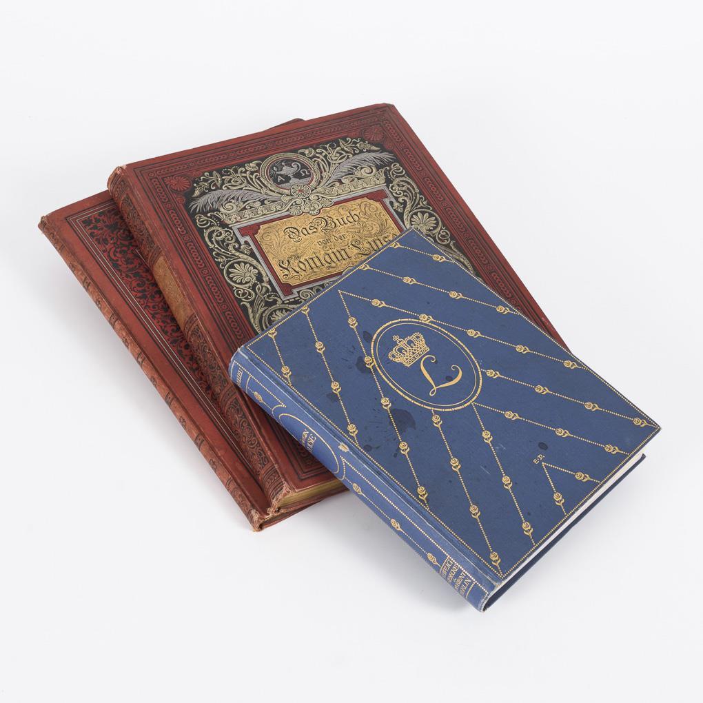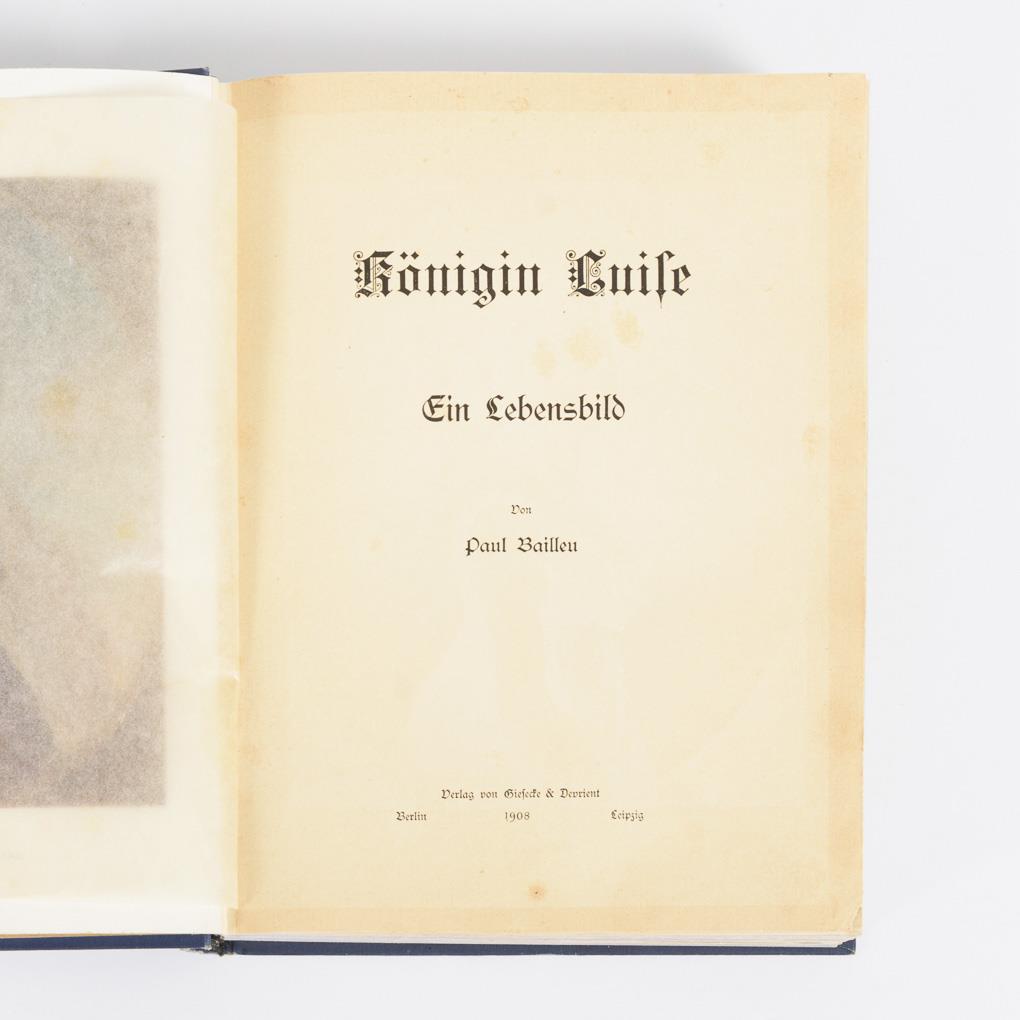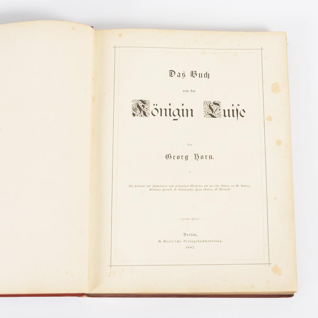 Paul Bailleu: "Königin Luise", published by Giesecke & Devrient, Berlin 1908, 387 pages. Cloth binding, 27.5 x 22 cm. / Georg Horn: "Das Buch von der Königin Luise" G. Grotesche Verlagsbuchhandlung, Berlin 1883, 204 pages. Embossed cloth binding with gilt edges, 37.5 x 29 cm. / J.H. Voß: "Luise." Grotesche Verlagsbuchhandlung, Berlin 1883. 88 pages, colored cloth binding and gilt edges, 37.5 x 29 cm. All books with illustrations. All with signs of age and wear.