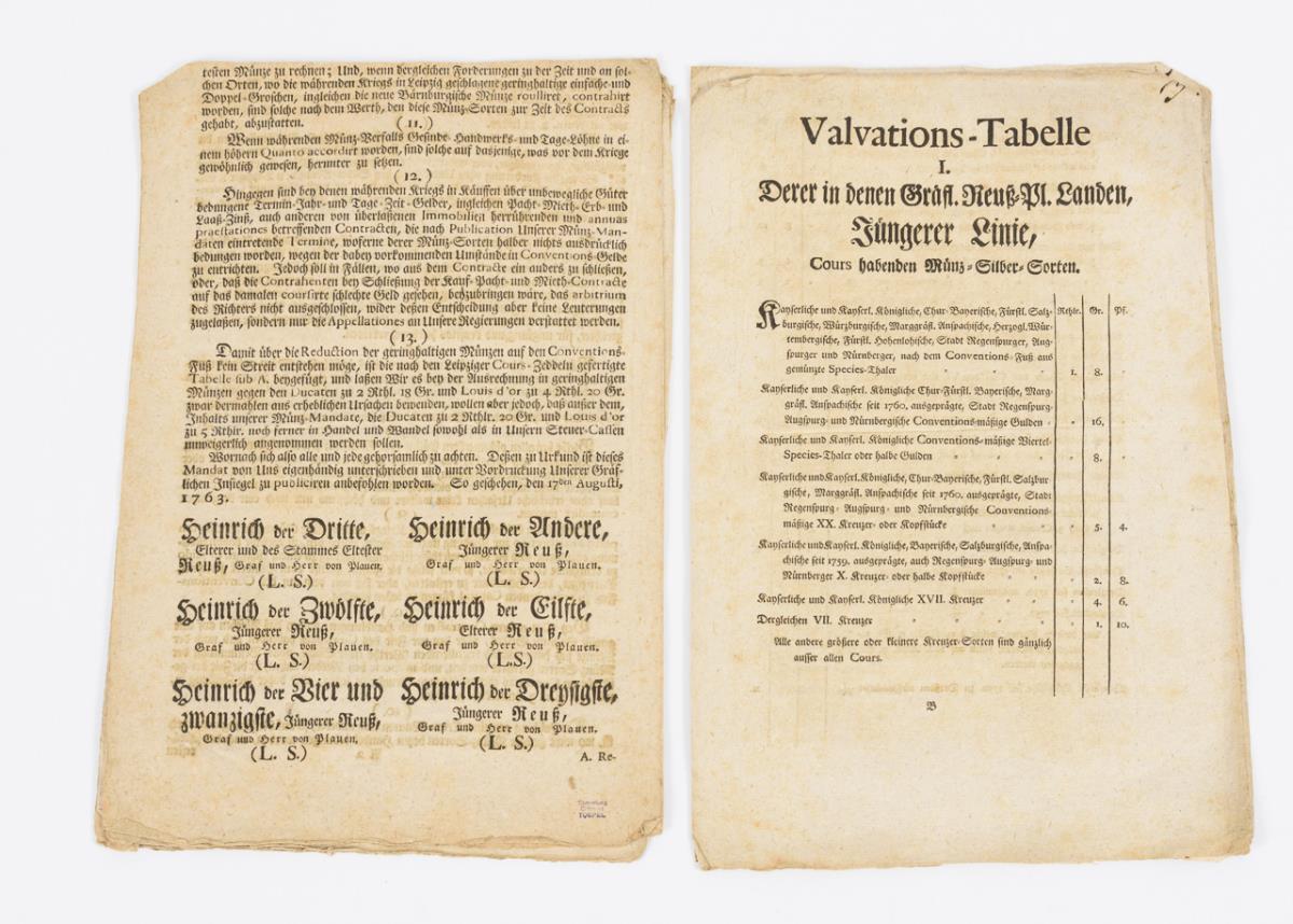 "Gräflich-Reuß-Plauisches Elterer und Jüngerer Linie Münz-Mandat, wegen Bezahlung derer, während Kriegs in geringhaltigen Münz-Sorten contrahirten Schulden, gegen Reduction nach dem Conventions-Fuß, vom 17. August 1763", 8 Seiten. / "... Münzmandat vom 25. April 1763", 8 Seiten. / "Münzen und Medaillen des Gesamthauses Reuss", Sonderdruck aus Auktionskatalog 51, Münz Zentrum Köln, 12 Seiten, 26,5 x 18,5 cm.