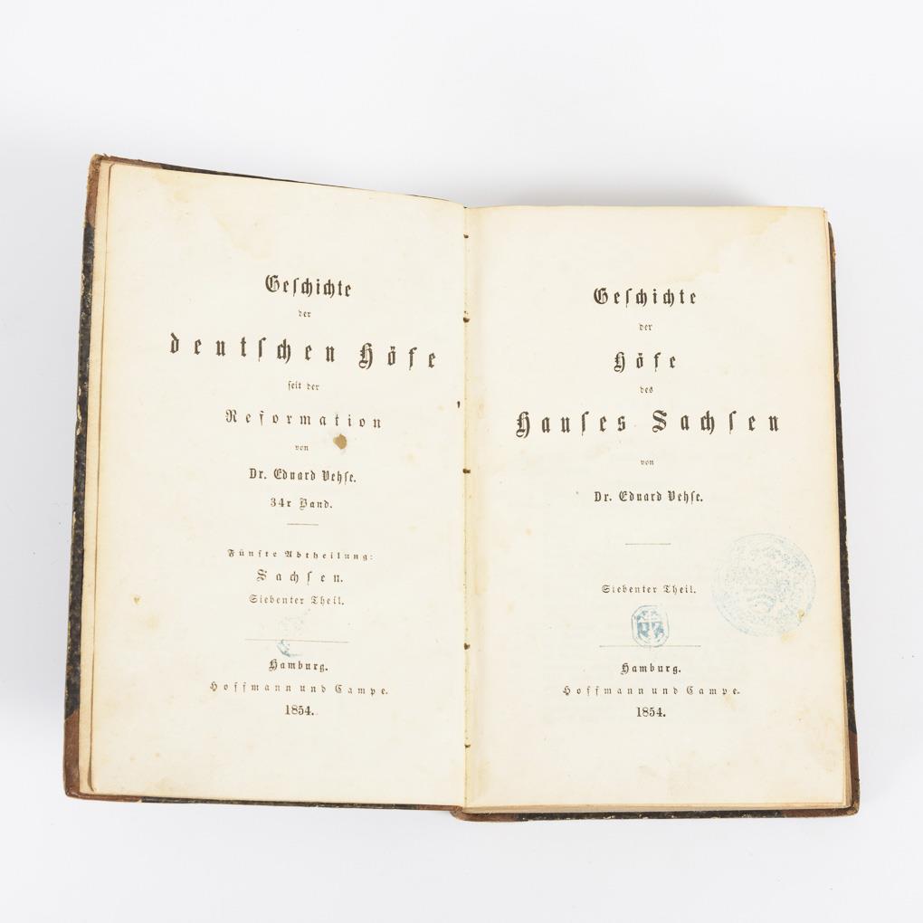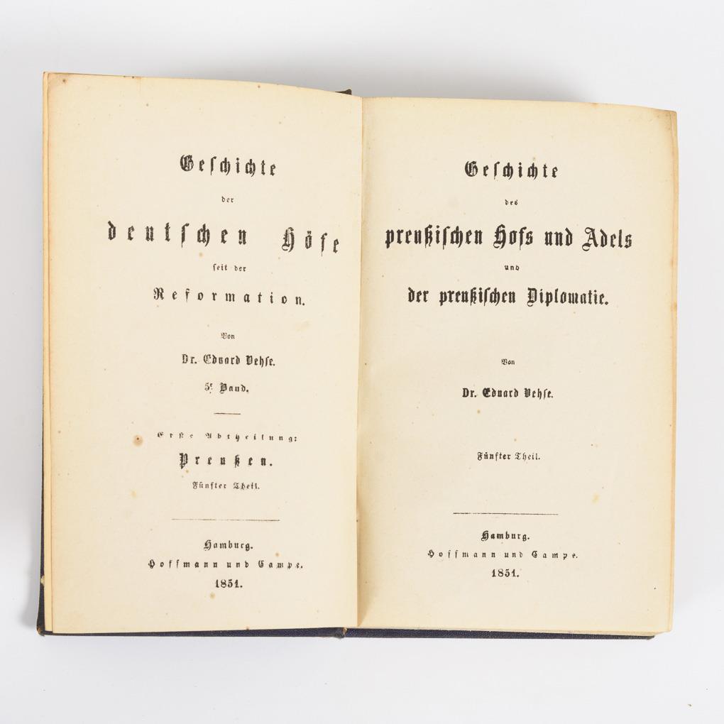 "Geschichte des preußischen Hofs und Adels und der preußischen Diplomatie", 312 Seiten. / "Geschichte der Höfe des Hauses Sachsen", 486 Seiten. Leinen- bzw. Halbledereinband. Alters- und Gebrauchsspuren.