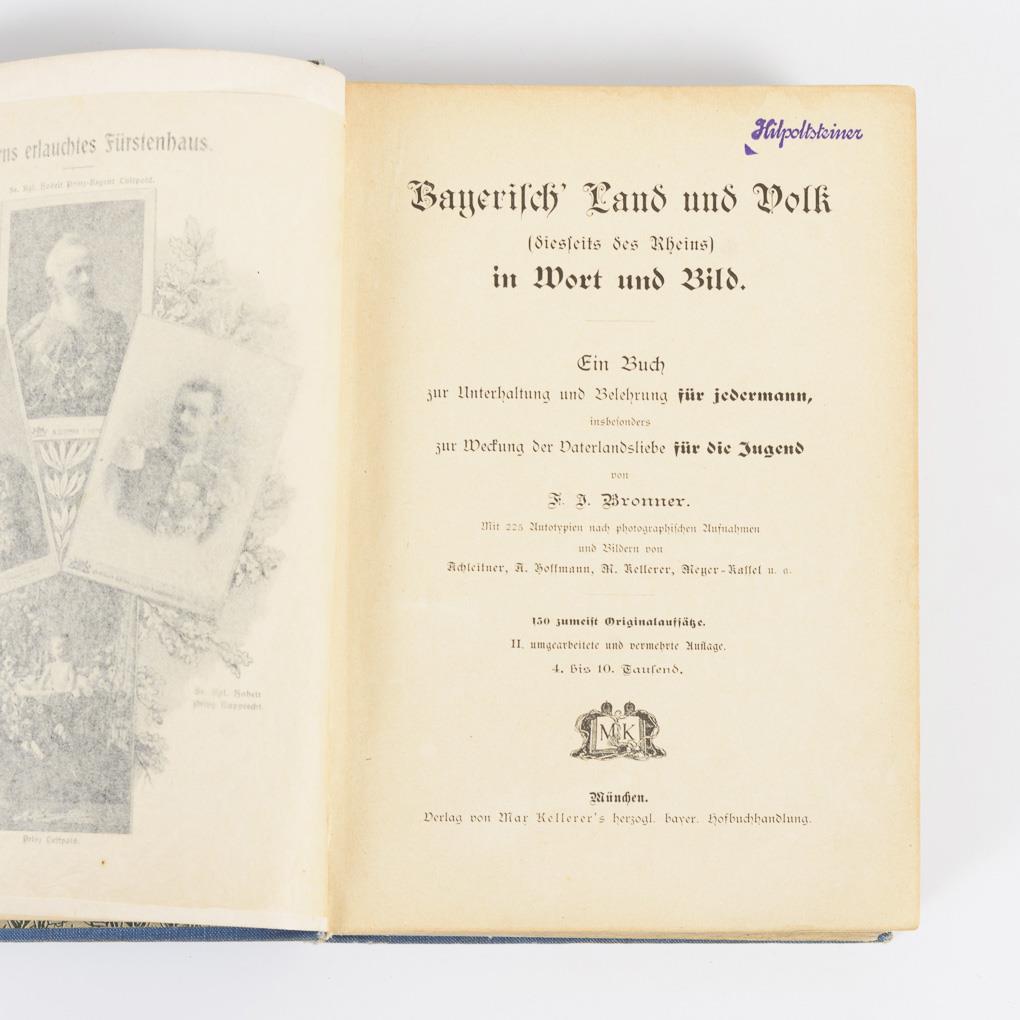 Bronner: "Bayerisch' Land und Volk in Wort und Bild", München o.J., Max Kellers Hofbuchhandlung, 655 Seiten, blauer Leineneinband, 22,5 x 16,5 cm. / Konrad Sturmhoefel: "Illustrierte Geschichte der Sächsischen Lande und ihrer Herrscher", Leipzig o.J., Verlag von Hübel & Denck. 1. Band 2. Abtheilung, Seite 599 - 1200. Farbiger Leineneinband, 24,5 x 18 cm. Alle mit sehr vielen Illustrationen. Alters- und Gebrauchsspuren.