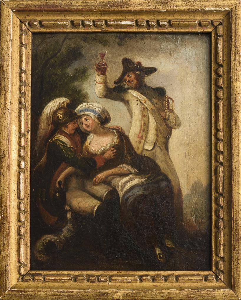 Kleines erotisches Barockgemälde mit Soldaten und Dirne