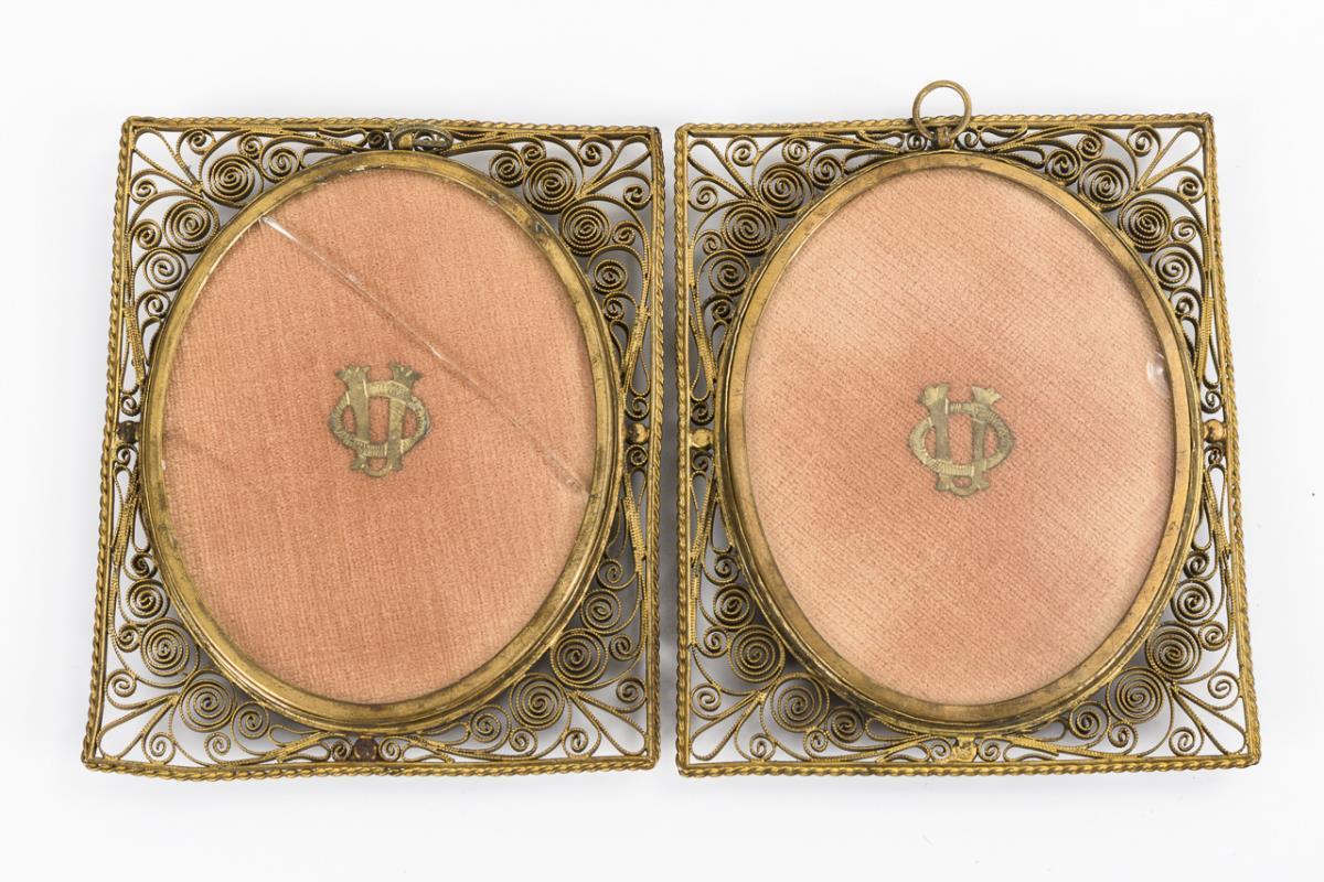 Übermalte Vordrucke auf Elfenbein(?), beidseitig verglaste Rahmen aus Messing-Filigran. 8 x 6,5 cm, Rahmen 10 x 8 cm.