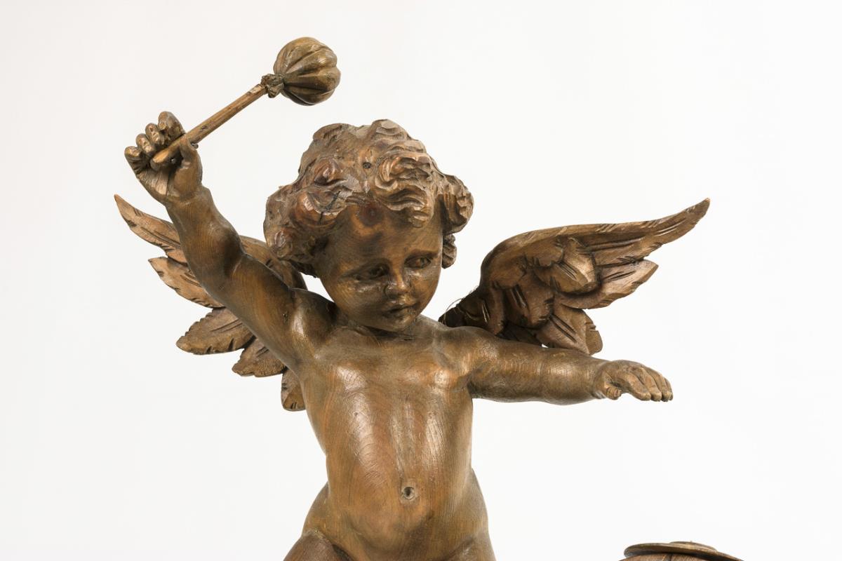 Mit kraftvollem Ausfallschritt und erhobenem Schlegel musizierender Engel. Flügel und Schlegelkopf abgebrochen, kaum Trockenrisse.