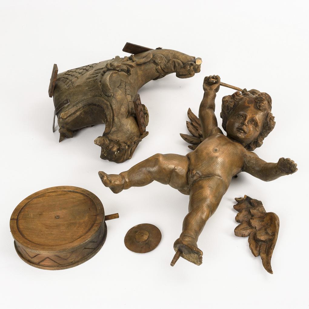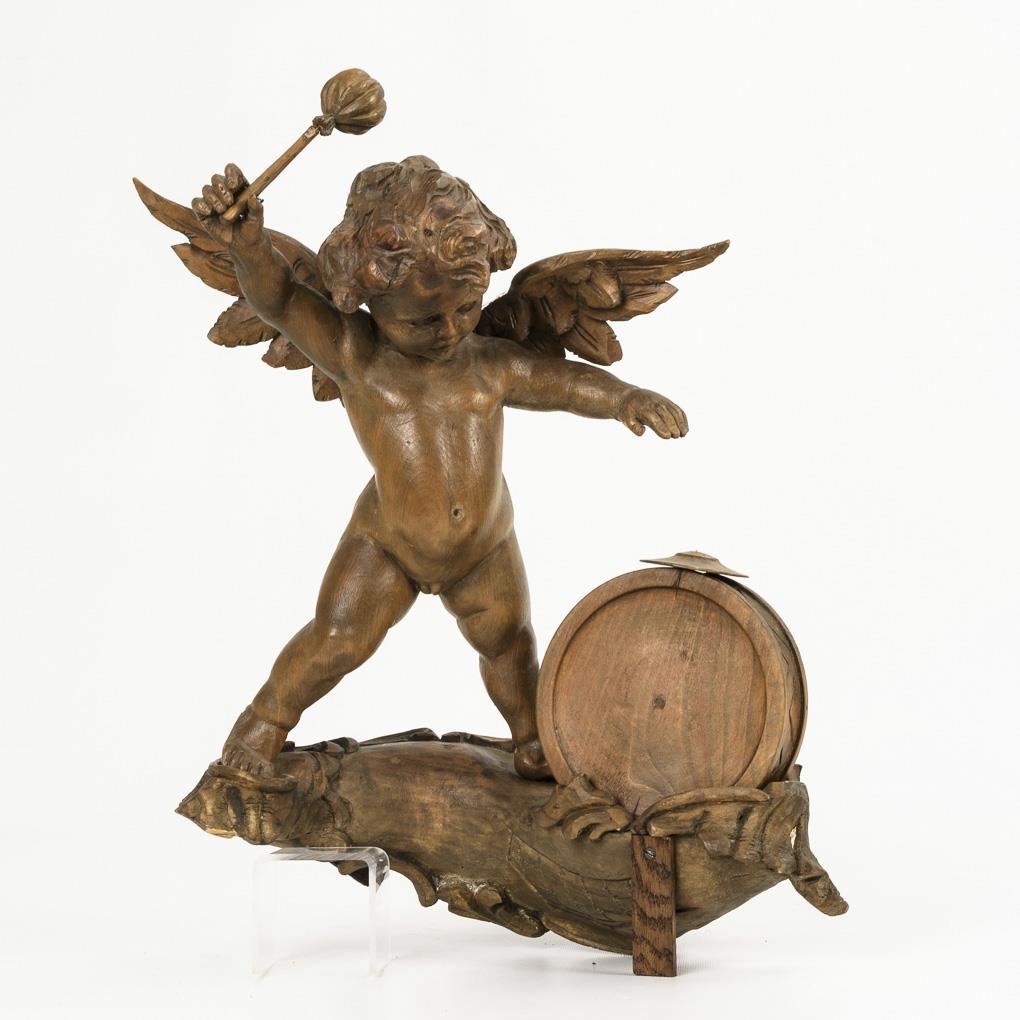 Verschiedene Hölzer, gebeizt. 2. Hälfte 19. Jh. H Engel ca. 35 cm, gesamt 40 x 45 x 25 cm.