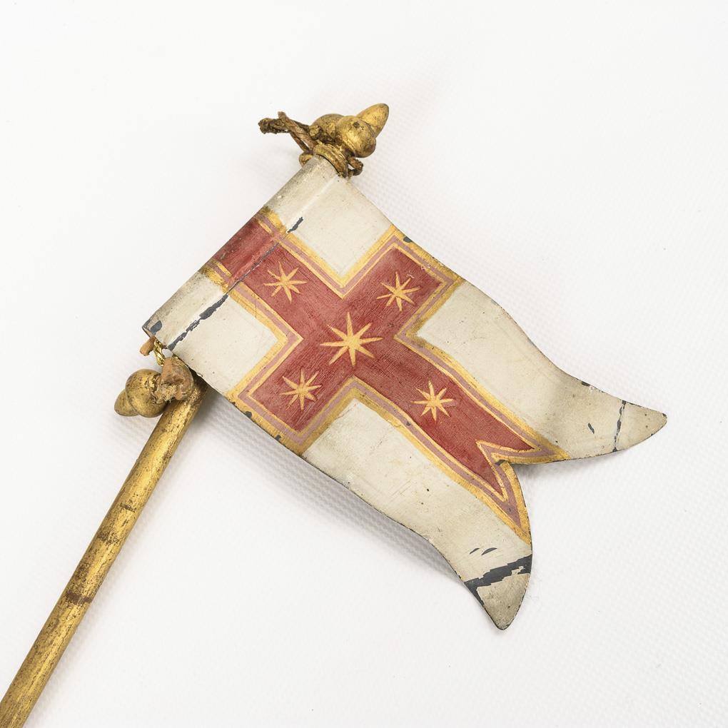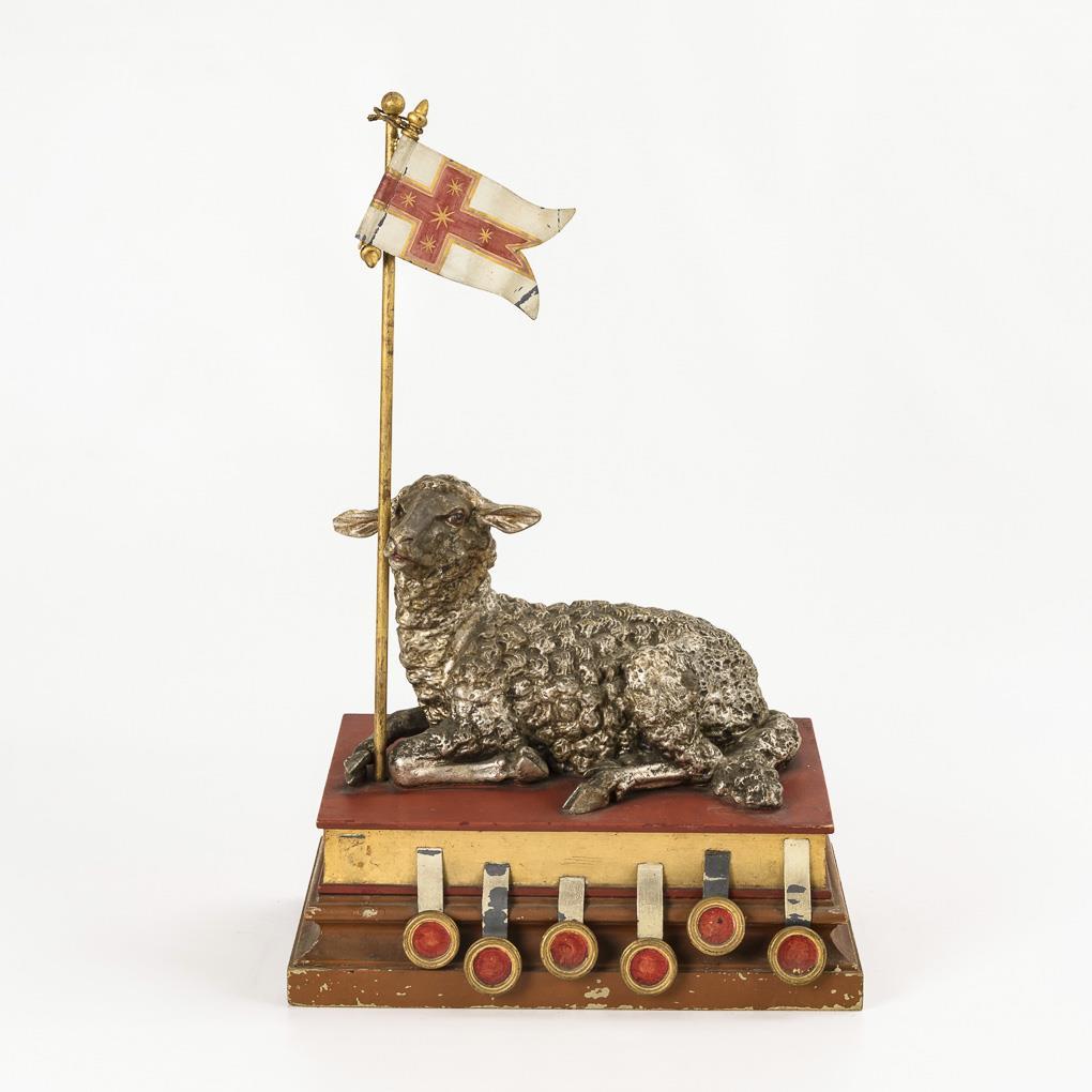 Auf dem Buch mit den sieben Siegeln liegendes Lamm der Offenbarung. 1 Siegel und 1 Ohrspitze fehlen, Fahnenhalter gebrochen, Farbabsplitterungen.
