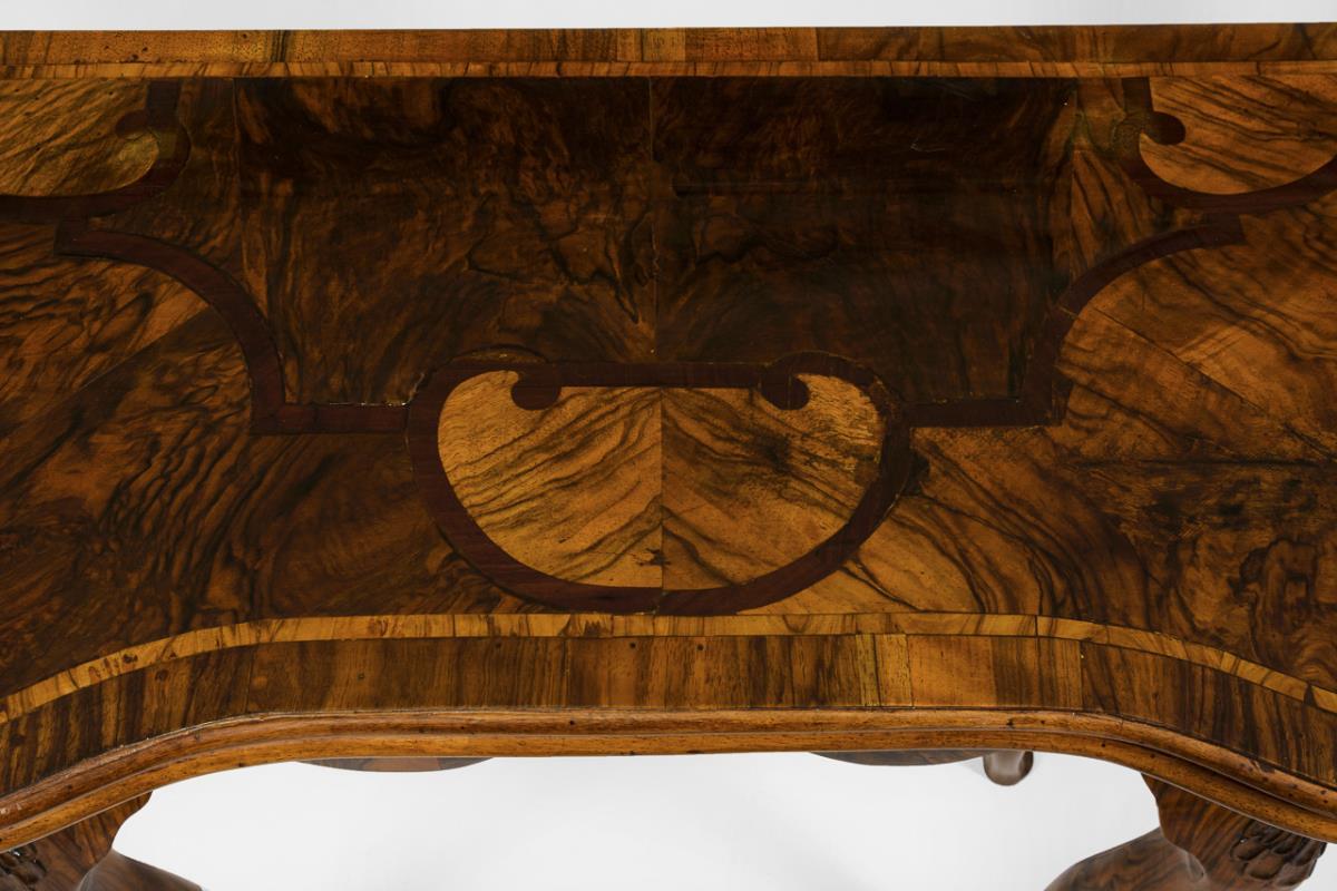 Zierlicher Klapp- und Konsoltisch mit raffinierter Ausziehfunktion in stiltypisch geschwungener Form, geschweifte Zarge mit Zargenschub; reich dekoriert mit Bandwerkmarketerie und Maserfurnier. Wohnfertig restauriert.