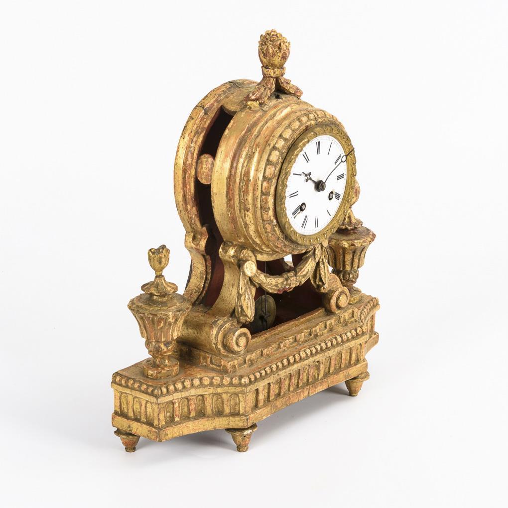 Pendule im Louis Seize-Stil mit seitlichen Vasen und Traubenbekrönung. Alters- und Gebrauchsspuren, Defekte, Reparaturen, Pendelglas fehlt.