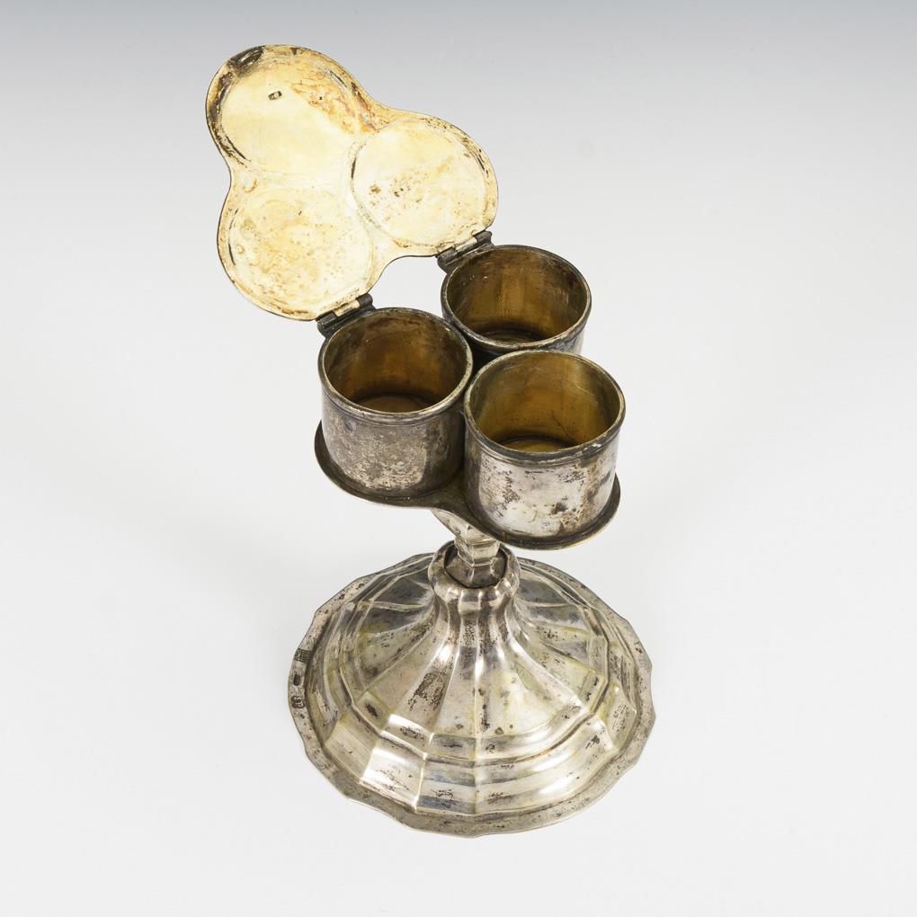 Sogenanntes "Chrismarium" oder "Chrismatorium", auf dem Deckel bezeichnet mit den Buchstaben "O", "C" und "I" für die 3 heiligen Öle. Einsätze fehlen, minimal gedellt.