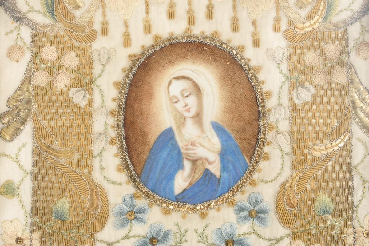 Betende Maria in aufwändig gestickter Ädikula-Rahmung mit Blüten. Verschmutzt, Rahmen berieben.