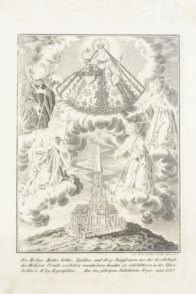 Maria lactans als "Mutter der reinen Liebe" von "Johan Hendl in München". / Gnadenbild zu Schildthurn mit Heiligen über der Kirche. / Loreto_Kindl. Schäden und Fehlstellen an der Maria lactans, je Alters-/Gebrauchsspuren.