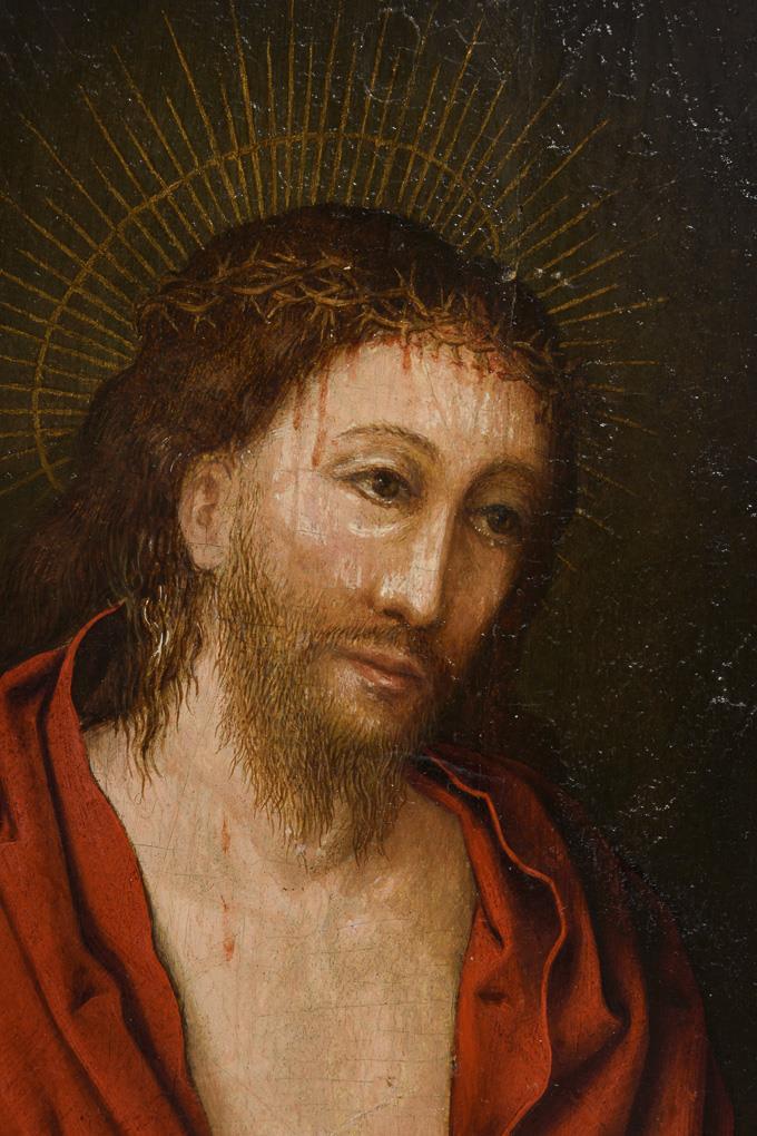 Der leidende Messias mit Heiligenschein und den Wundmalen der Kreuzigung. Altersspuren.