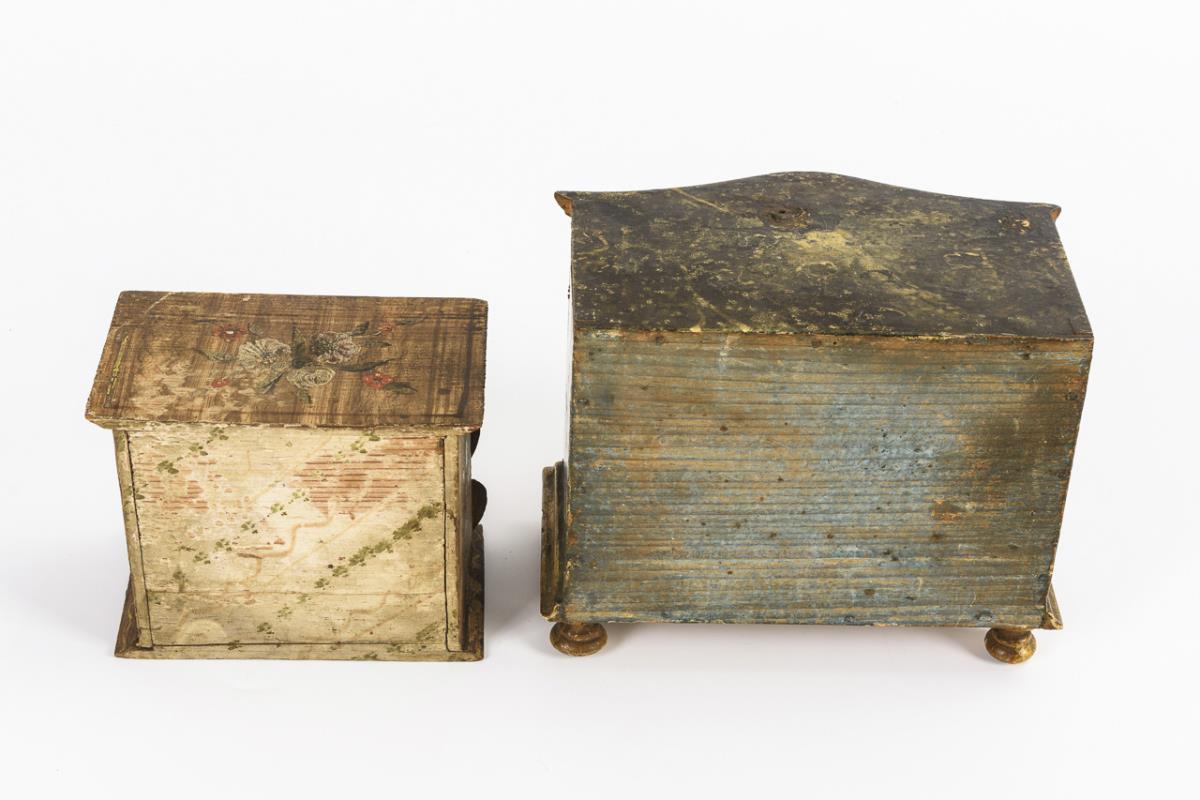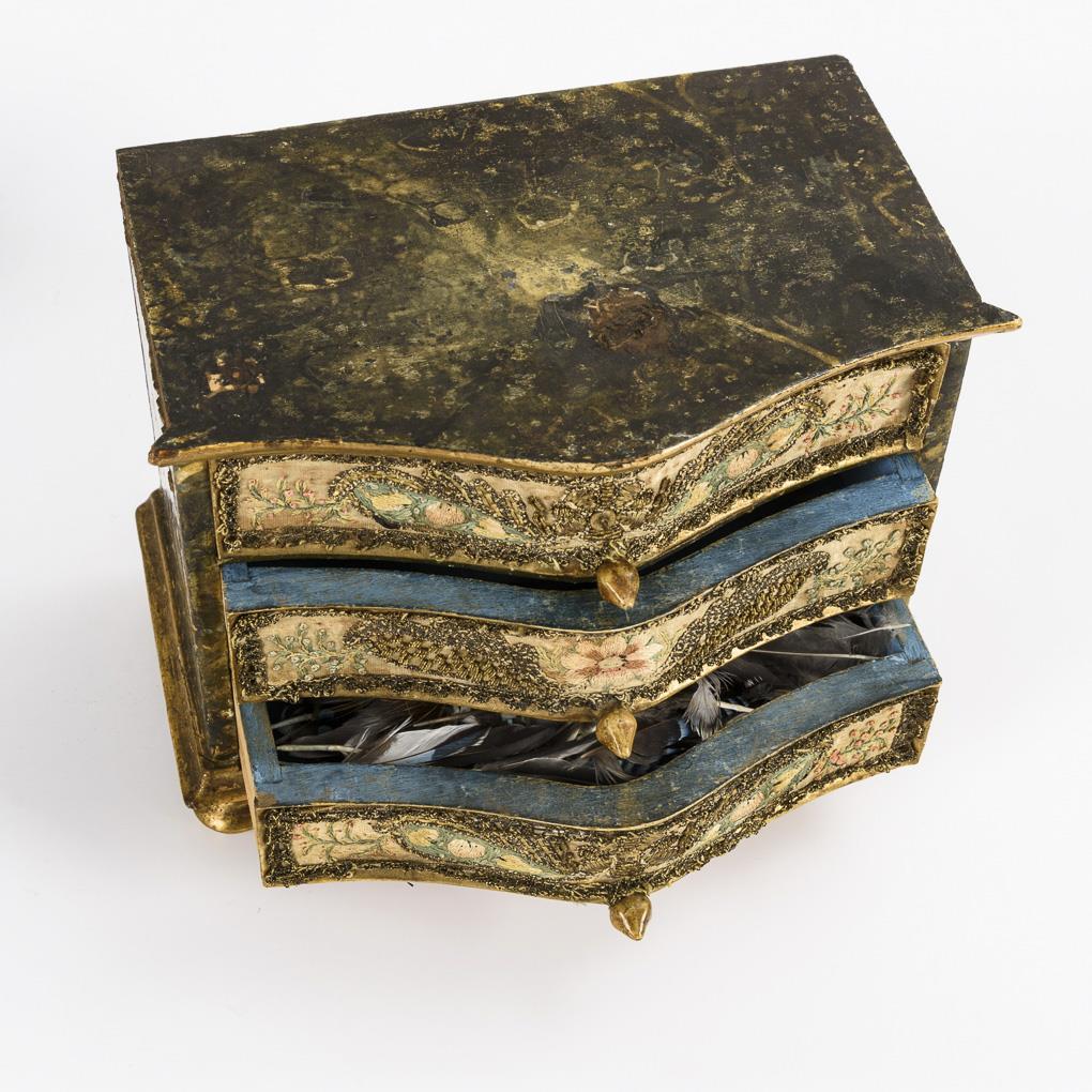 Holz, Marmorpapier und Stickerei mit Lahn bzw. Bierlasur und Tempera. Maximal 13,5 x 17,5 x 11 cm.